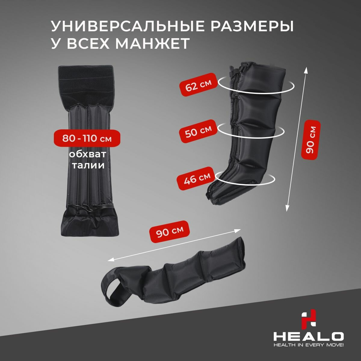Уникальный компрессионный массажер позволяет проводить сеансы процедуры прессотерапии в домашних условиях. Массажный комплект состоит из : 2 манжеты для ног, 1 манжета для руки, 1 манжета для талии и аппарат для управления массажем (сумка в комплект НЕ входит). Обхват икроножной части 50 см, обхват бедра 62см. Одновременно Вы сможете подключить 2 вида манжет. Например: ноги (2 шт.) + талия или талия + рука. Если Вы хотите использовать 1 манжету, например, промассажировать только талию, то в свободный разъем аппарата необходимо вставить заглушку, чтобы не выходил воздух и аппарат работал корректно. Заглушка предоставляется в комплекте.4 режима работы.