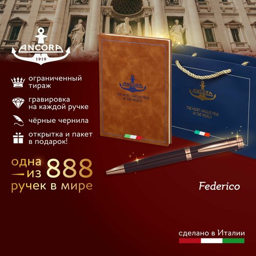 Откройте для себя исключительную элегантность шариковой ручки Ancora 1919 Italia "Federico". Этот роскошный пишущий инструмент является вершиной утонченности и выдающимся образцом в серии Elegance. Ограниченный выпуск всего в 888 ручек на весь мир, эта изысканная ручка является данью одному из величайших режиссеров всех времен, Федерико Феллини. Роскошное покрытие из бордового лака прекрасно дополняется деталями из розовой позолоты, создавая вечный дизайн, который излучает утонченность. Идеально сбалансированная для комфортного удержания и плавного письма, каждая ручка воплощает элегантность и превосходное мастерство. Ручка "Federico" сертифицирована производителем, что делает ее идеальным подарком или личным удовольствием. Ощутите исключительность и позвольте вашим словам течь с элегантностью ручки Federico, которая воплощает изысканный вкус и сентиментальность, создавая незабываемые воспоминания.