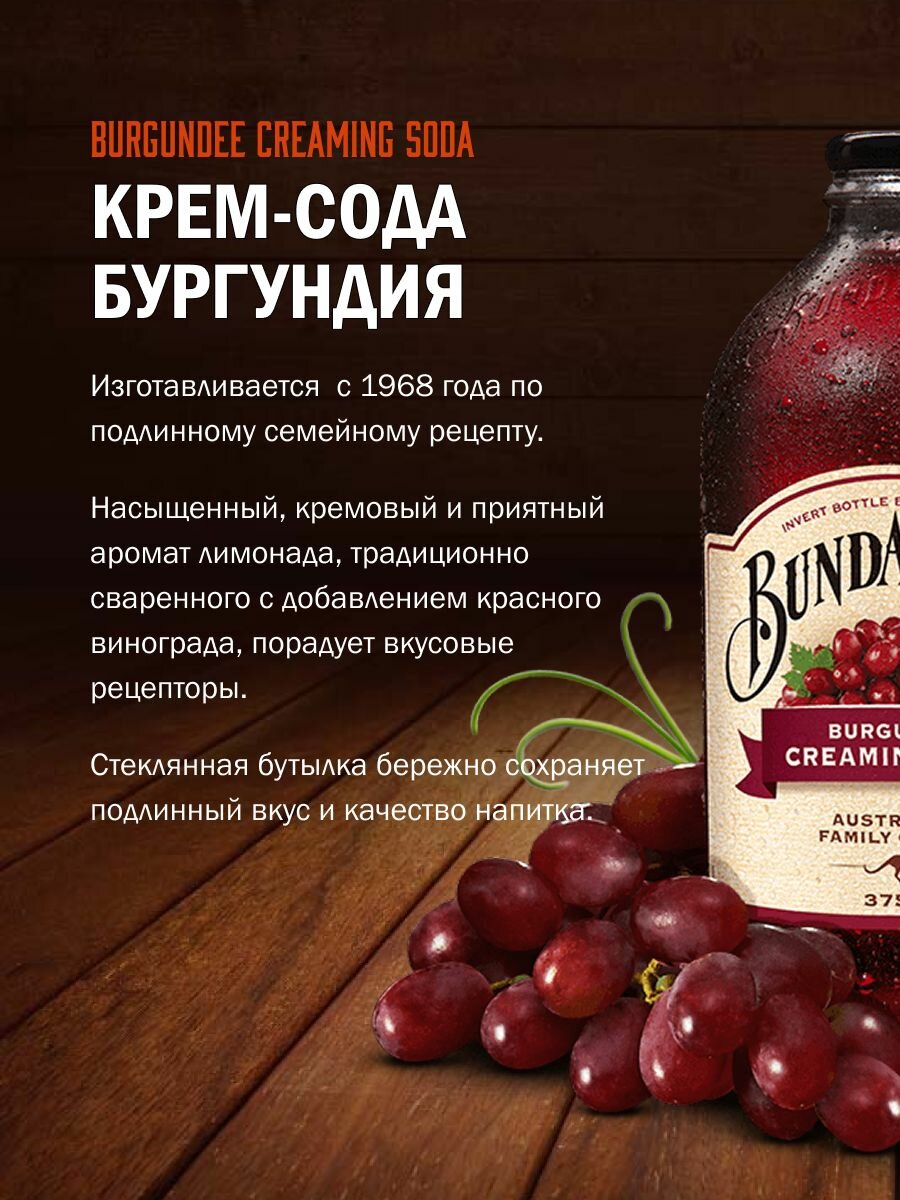 Вневременной вкус нашей Бургундской крем- соды вызывает восхищение у всех возрастов на протяжении многих поколений. Изготовленный по аутентичному рецепту, этот напиток из красных ягод является единственным в своем роде. Ферментируется более 3 дней. -----Bundaberg Fermented Beverages - лидер на рынке безалкогольных напитков премиум-класса в Австралии и Новой Зеландии. Компания Bundaberg производит ферментрованные крафтовые напитки по уникальным семейным рецептам с 1968 года и успешно экспортирует свою продукцию в более чем 30 стран мира. В основе успеха и признания напитков Bundaberg лежит секрет использования натуральных фруктовых соков, трав, специй и сахарного тростника, который произрастает на плодородной почве штата Квинсленд в субтропической Австралии. Процесс приготовления вкусного ассортимента Bundaberg сложный и многоступенчатый. Особое место в нём занимает ферментация, которая длится от 1 до 7 дней, ровно столько, сколько это необходимо для достижения исключительного вкуса. Все напитки Bundaberg являются нефильтрованными, и естественный осадок – это признак натуральности продукта. Переверните и покатайте бутылку перед открытием, этот захватывающий ритуал подчеркнёт уникальность и аутентичность процесса употребления напитка. Напитки Bunderburg хороши как сами по себе, так и в качестве основы для приготовления коктейлей. Стеклянная бутылка особой формы сохраняет целостность напитков и подчеркивает премиальность продукта.