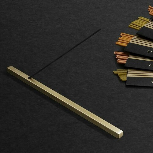 Набор для ароматерапии в модернистском стиле от американского бренда Cinnamon Projects. Подставка прямоугольной формы выполнена из латуни. На поверхности подставки расположено отверстие для благовония. В комплект входят пять видов ароматических палочек, по десять штук каждого вида.