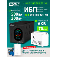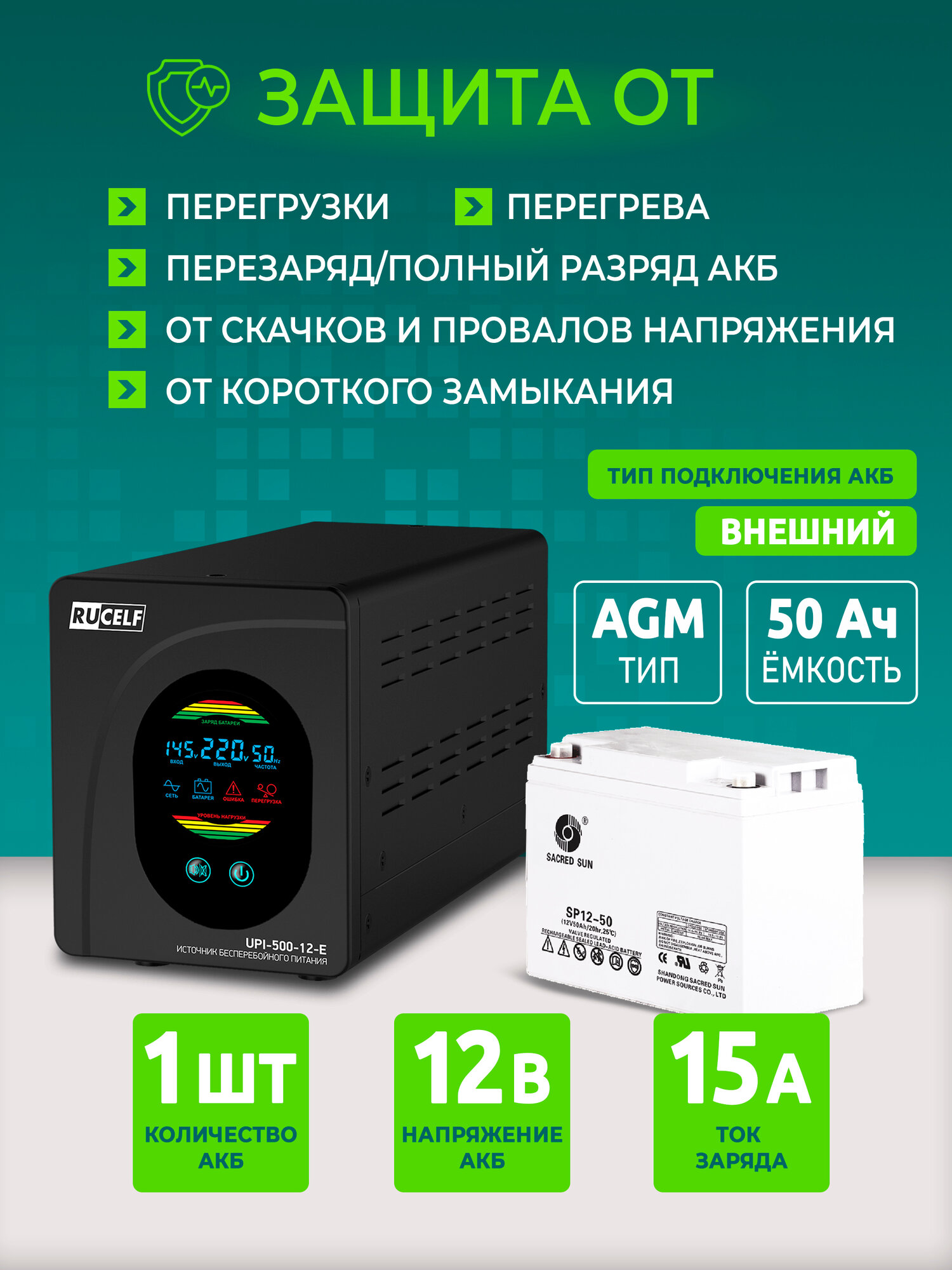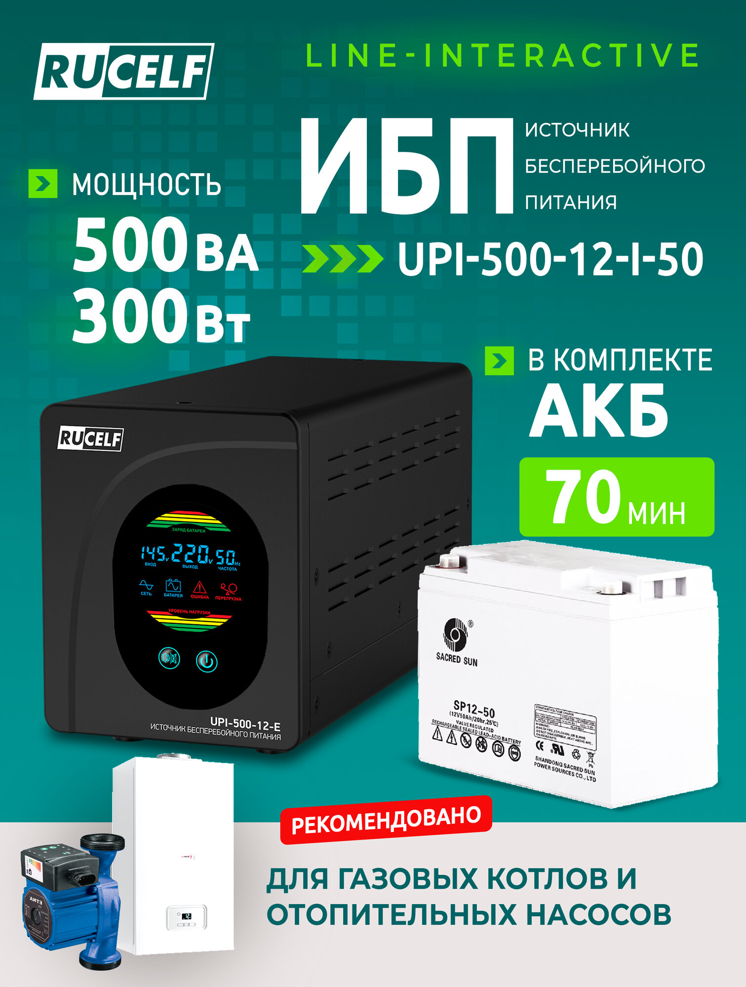 Комплект Линейно-интерактивный ИБП (smart UPS) RUCELF UPI-500-12-I-50 с Аккумулятором, AGM 50 Ач — 12В / 300Вт — 70 мин: сравнение цен, характеристики, фото, актуальное наличие и цены.