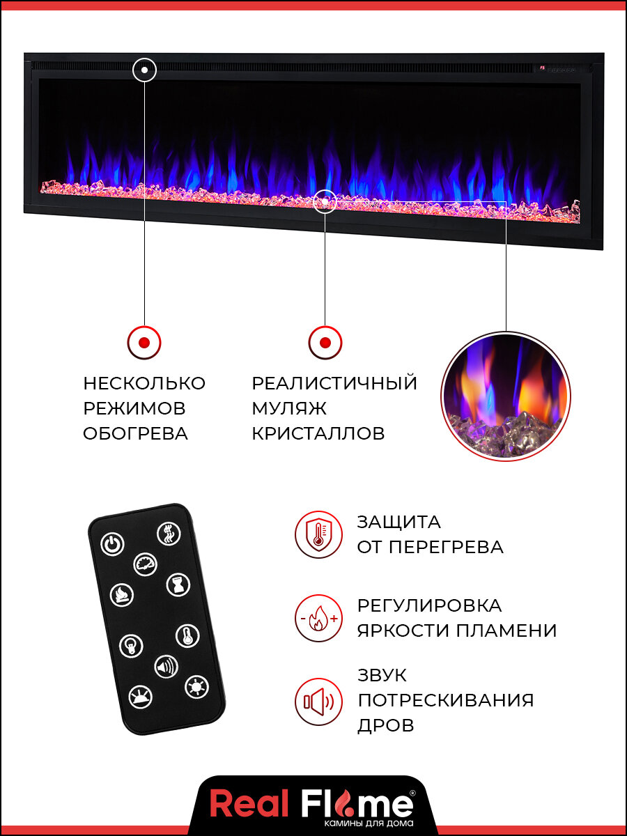 | Дополнительная информация | 2 уровня регулировки обогрева, регулировка яркости пламени, светодиодные лампы, 6 вариантов цвета пламени, таймер отключения, 10 вариантов подсветки кристаллов, защита от перегрева, звуковой эффект |