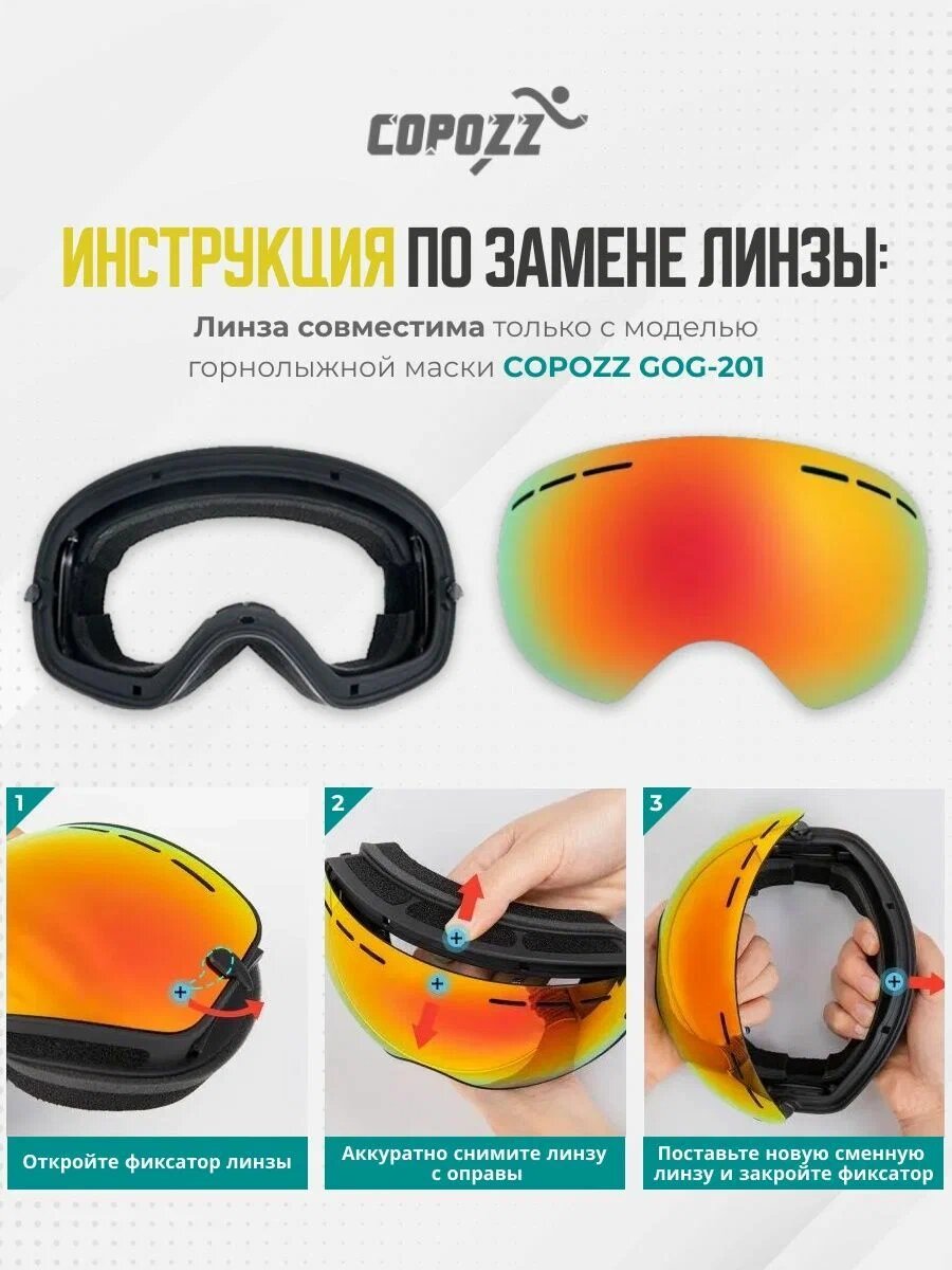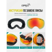 Линза COPOZZ обладает отличной совместимостью с горнолыжными очками практически любого производителя. Инструкция по замене линзы включена в комплект, что позволяет легко и быстро заменить ее без дополнительных усилий.
