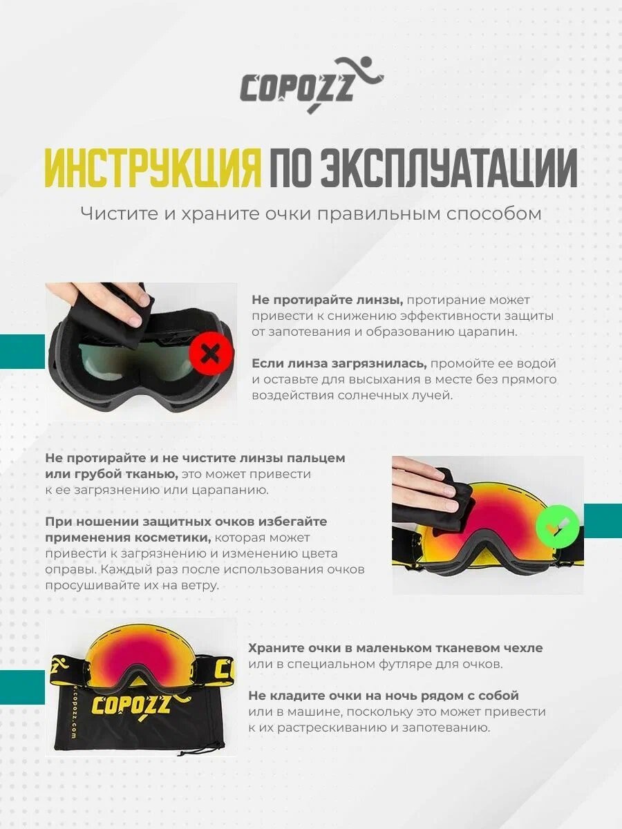 Для того чтобы ваша линза всегда оставалась в идеальном состоянии, комплект поставки включает в себя чехлы для хранения и защиты линзы от повреждений и засорений. Помимо этого, линза COPOZZ также совместима с многими моделями лыжных очков и горнолыжных масок, что делает ее универсальным решением для любителей активного отдыха на горных склонах.