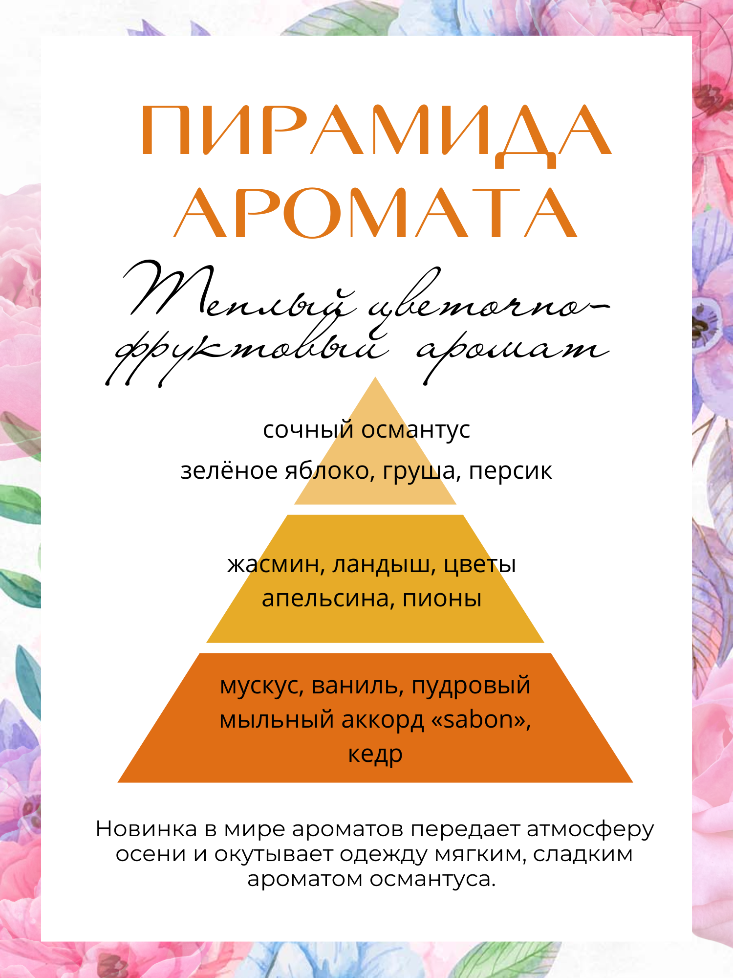 Нежный цветочный аромат нежно цветущего османтуса с мягким, сладким ароматом, который распространяется с освежающими нотами апельсина и персика. Кондиционеры для белья растительного происхождения создают мягкую, пушистую одежду.