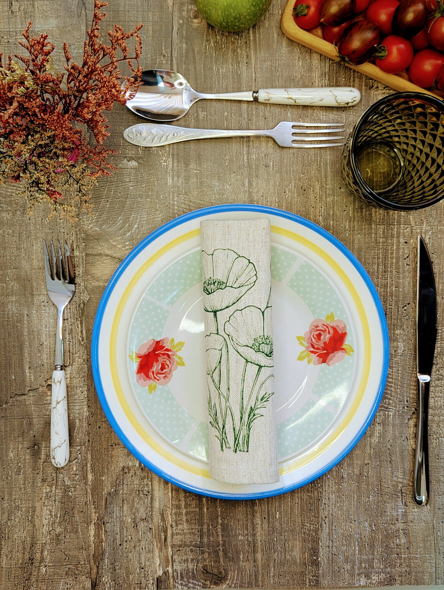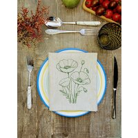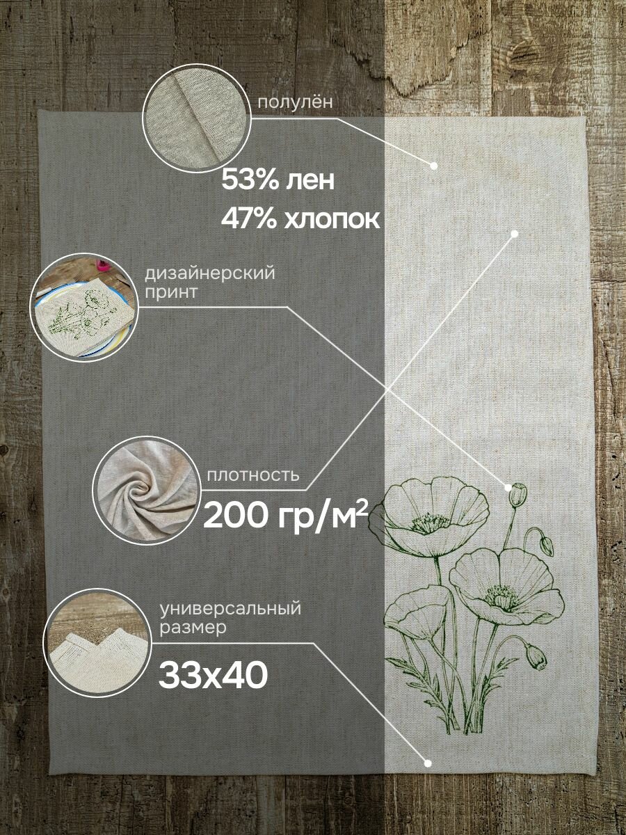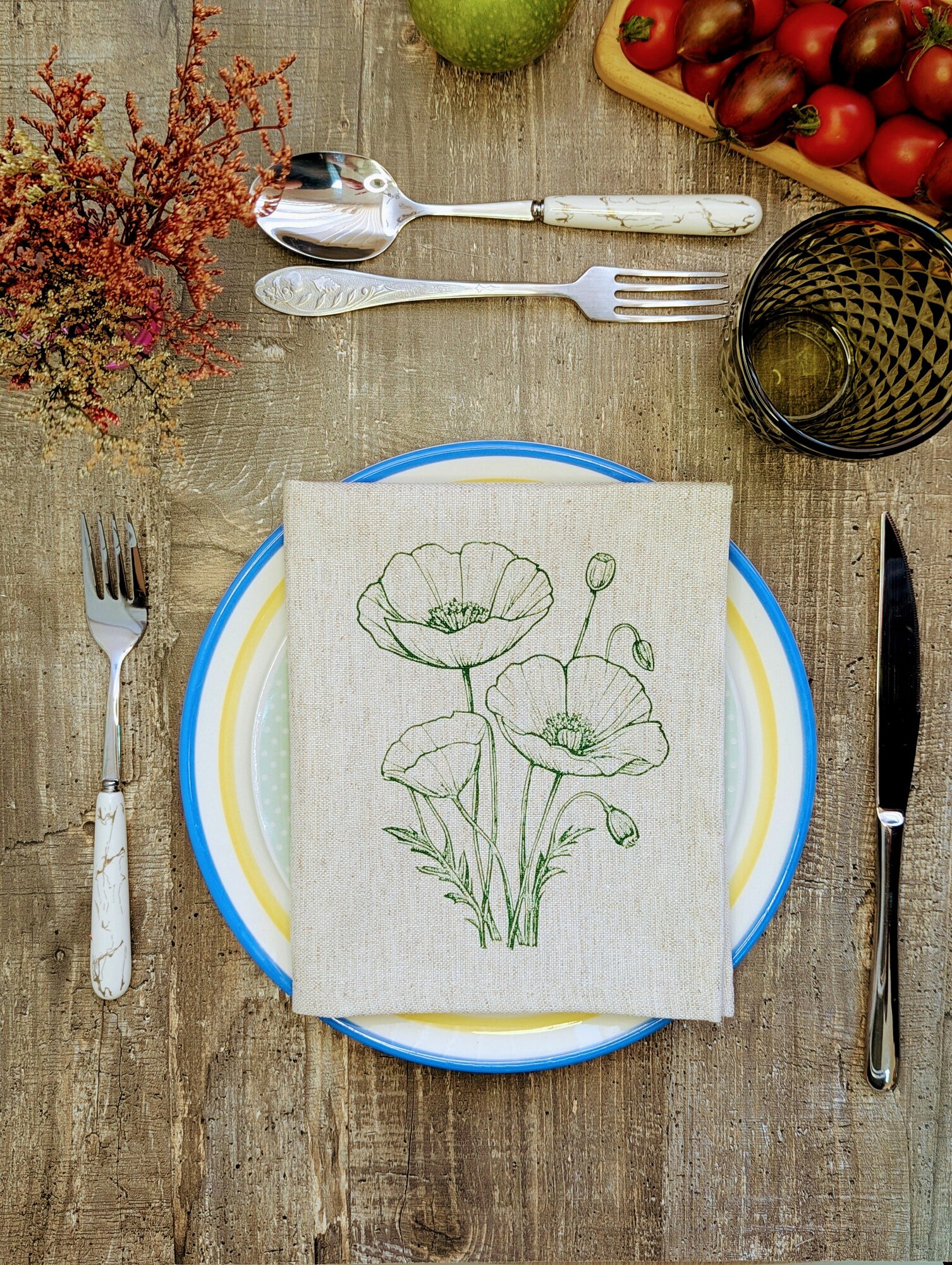 Но настоящая душа этого набора — его эксклюзивный рисунок. Вместо ярких и броских узоров мы предлагаем погрузиться в глубину и умиротворение. На каждое полотно вручную нанесен уникальный рисунок — однотонные зеленые цветы мака. Этот образ полон символики. Мак издревле ассоциируется со сном, покоем и плодородием, а выбранный изумрудно-зеленый цвет говорит о гармонии, природе и жизненной силе. Такой орнамент не кричит, а шепчет. Он создает невероятно спокойную и утонченную атмосферу, делая эти тканевые салфетки универсальными для любого стола: от утренней чашки кофе в одиночестве до торжественного ужина при свечах.