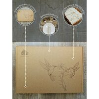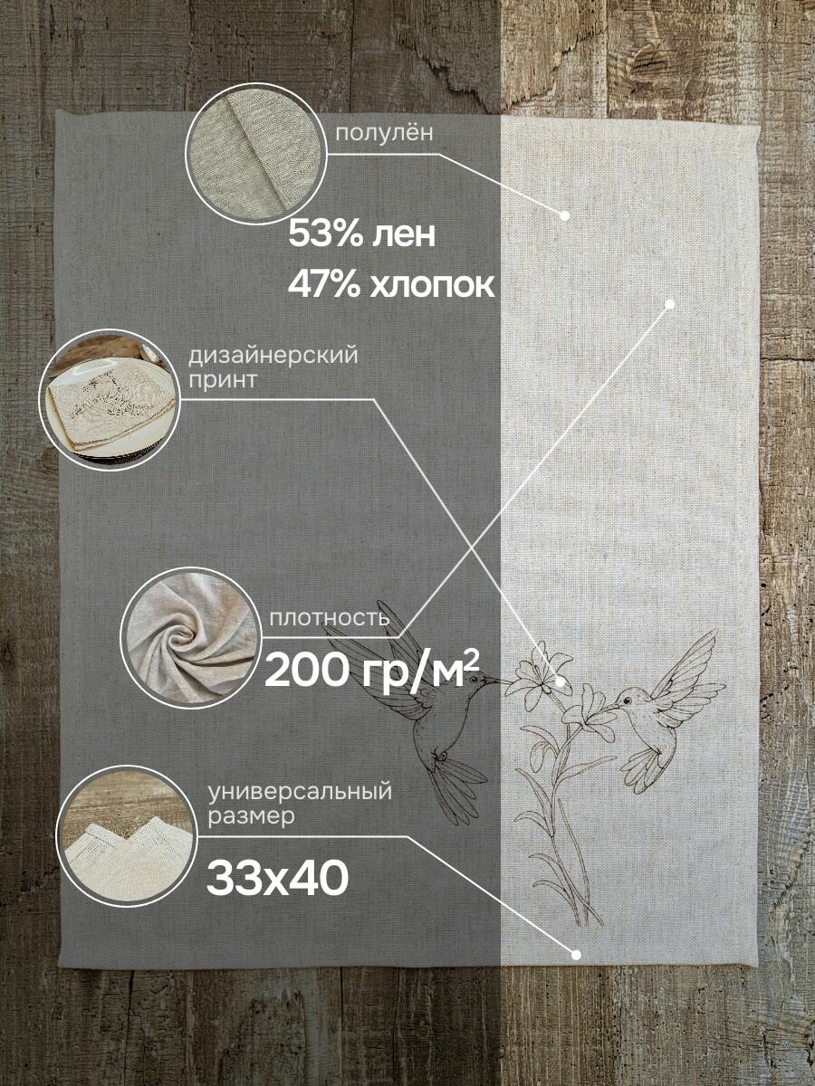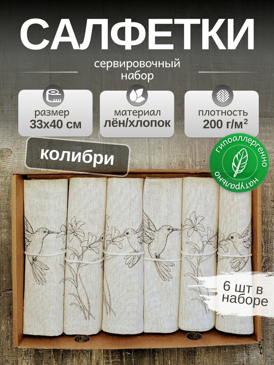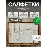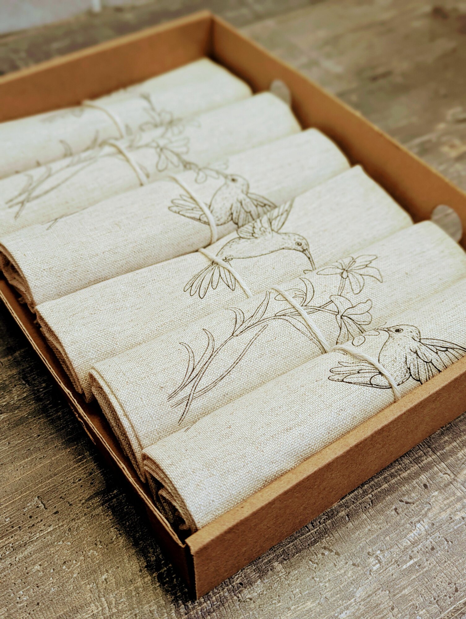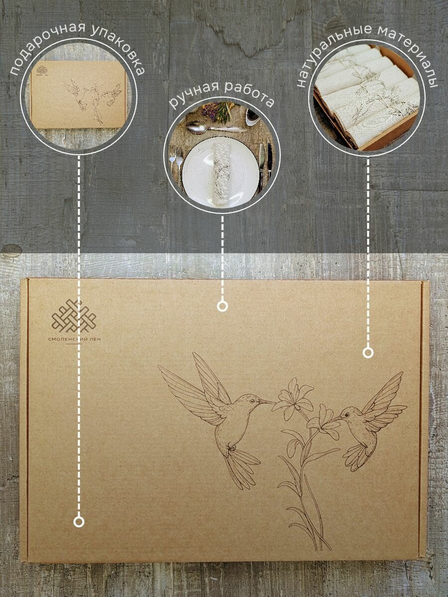 Но истинная душа этого набора — его уникальный рисунок. Это не массовый принт, а эксклюзивная ручная работа. На нежном, природном фоне ткани парит изящный дуэт колибри, застывший в грациозном танце вокруг нежного цветка. Рисунок выполнен в глубоком черном цвете, что создает потрясающий контраст и делает композицию одновременно лаконичной и невероятно выразительной. Эта история о легкости, любви и красоте природы, которая оживает прямо на вашем столе. Такие сервировочные салфетки становятся темой для разговора, объектом восхищения и источником эстетического удовольствия.