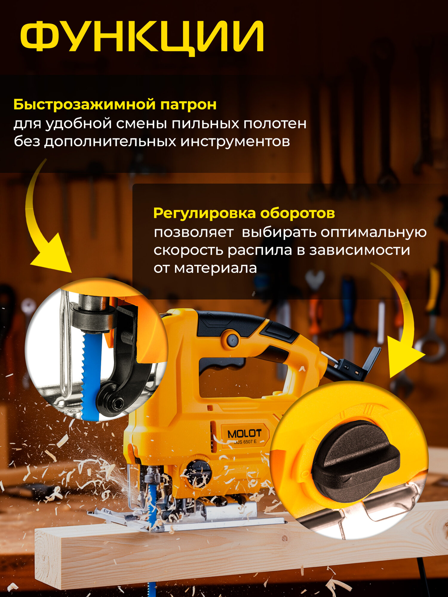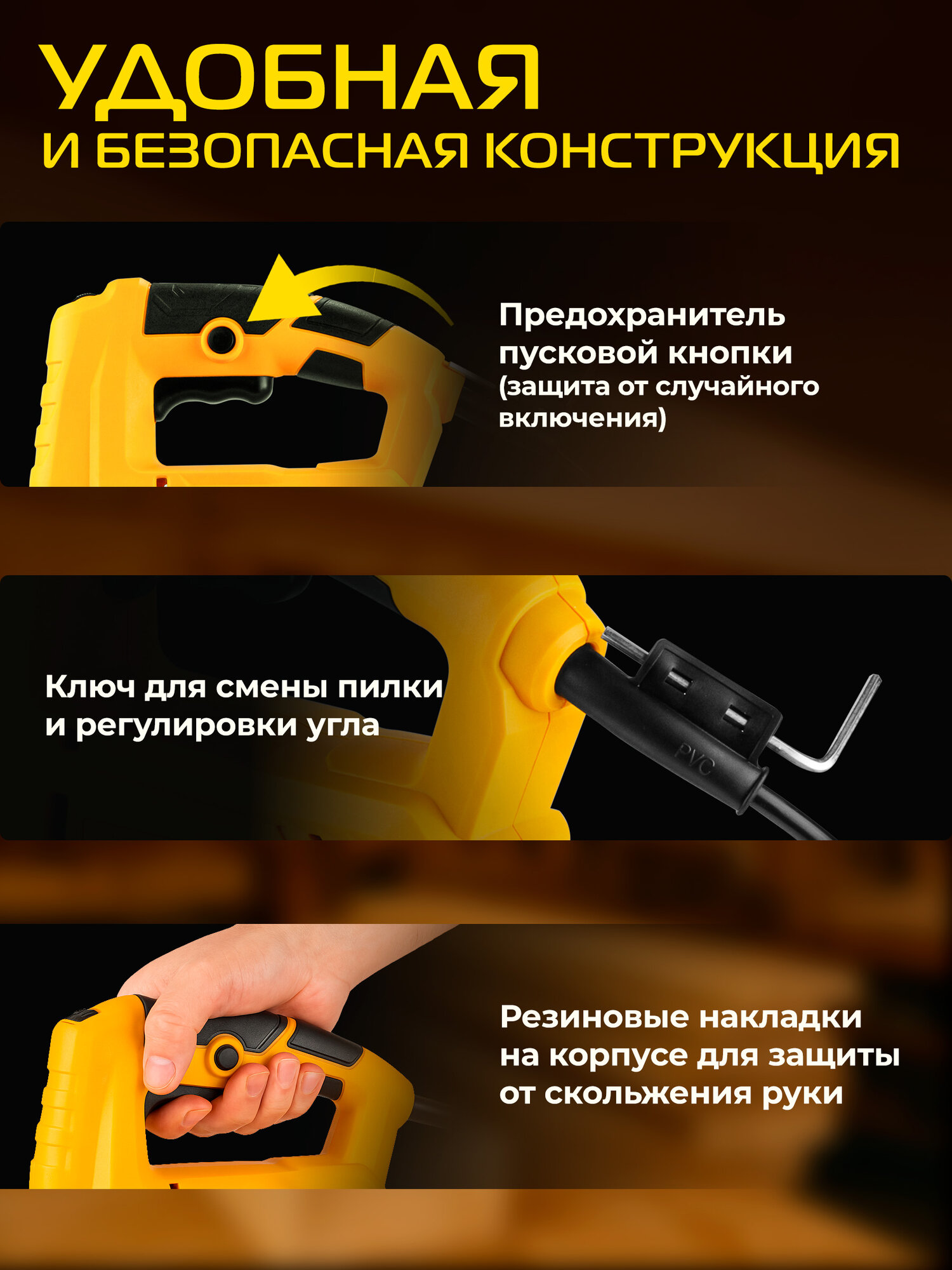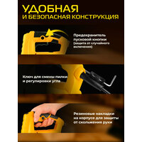 | Особенности конструкции | быстрозажимное крепление пилки, возможность подключения пылесоса, защитный щиток, обрезиненная рукоятка, подсветка, регулировка наклона подошвы без инструмента |