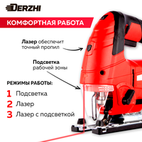 Купить Лобзик электрический сетевой с лазерным указателем DERZHI 850Вт (110мм пропил, 0-3000 оборотов/мин, маятниковый ход, 3 режима, 6 скоростей) с доставкой по всей России.