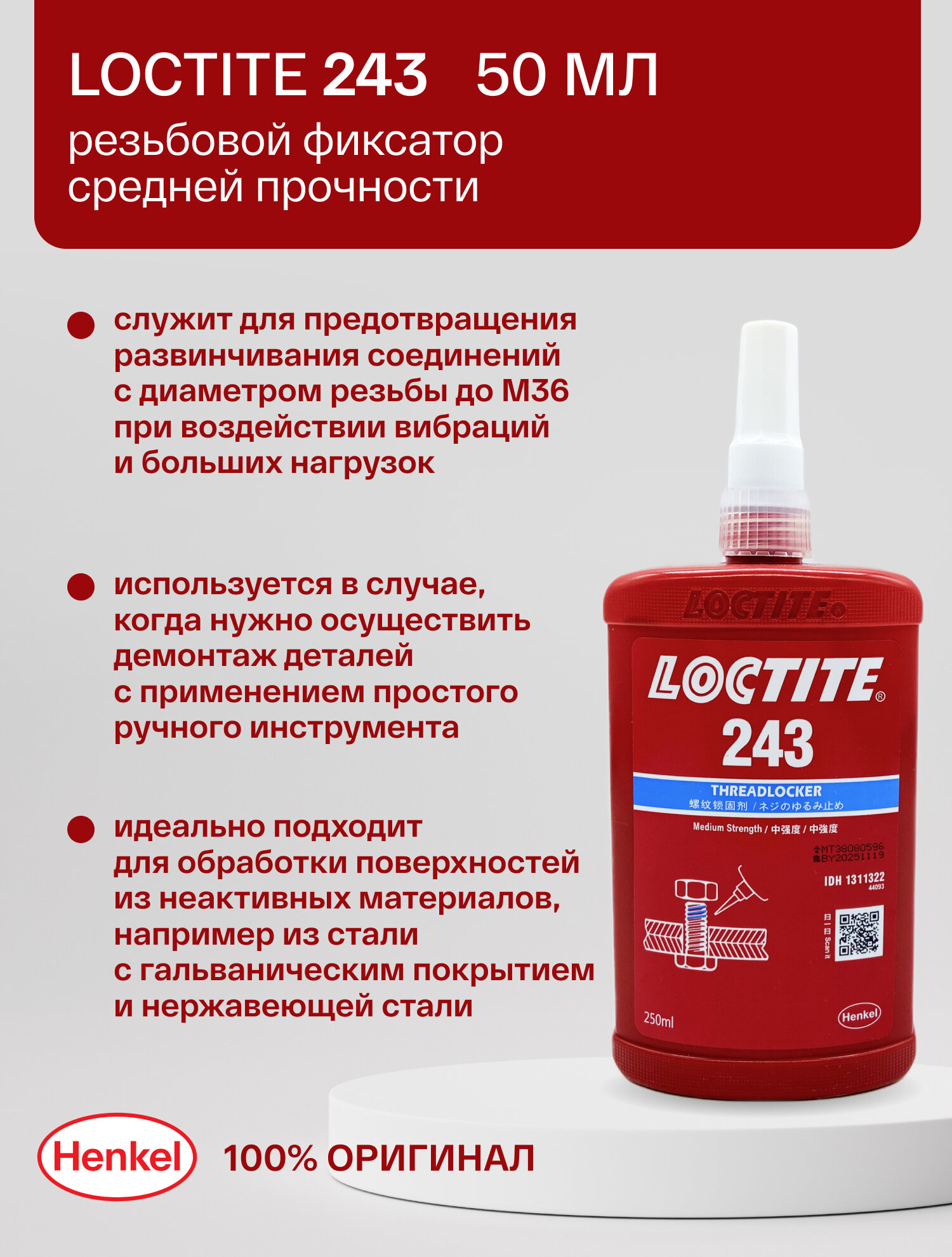 Купить LOCTITE 243 250ML Резьбовой фиксатор средней прочности Китай с доставкой по всей России. LOCTITE 243 250ML Резьбовой фиксатор средней прочности Китай: сравнение цен, характеристики, фото, актуальное наличие и цены.