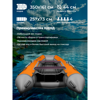 RB-350 (НДНД) — удобная лодка для рыбалки в компании 1-2 человек. Надувное дно низкого давления (НДНД) делает лодку компактной и лёгкой, её сборку простой и быстрой, а плавание комфортным. Значительная ширина лодки и большой диаметр баллона делают её устойчивой на воде. Лодка имеет бортовой привал.