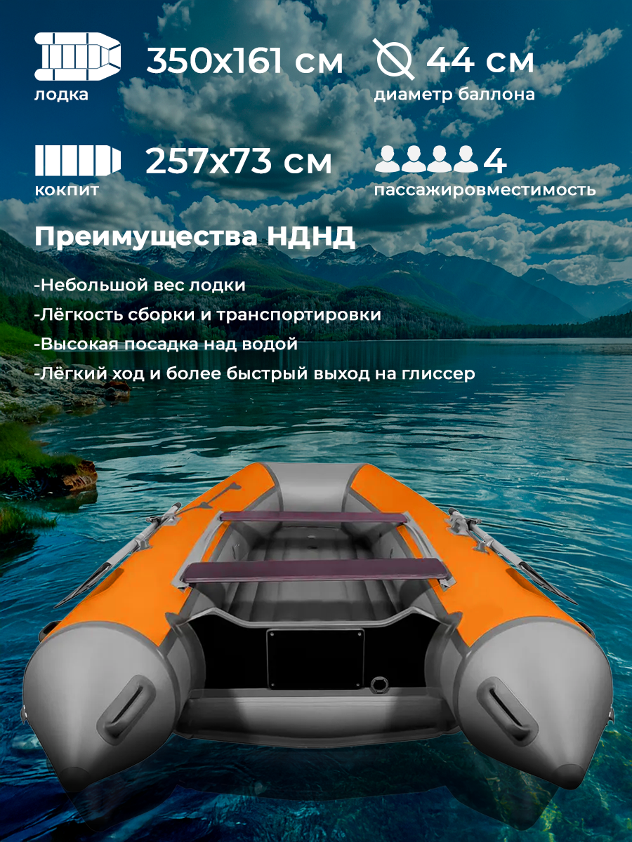 Надувная лодка ПВХ RiverBoats RB-350 НДНД длиной 350 см. и шириной 161 см. Имеет баллоны диаметром 44 см. Предназначена для четырёх человек, общая грузоподъемность 500 кг.