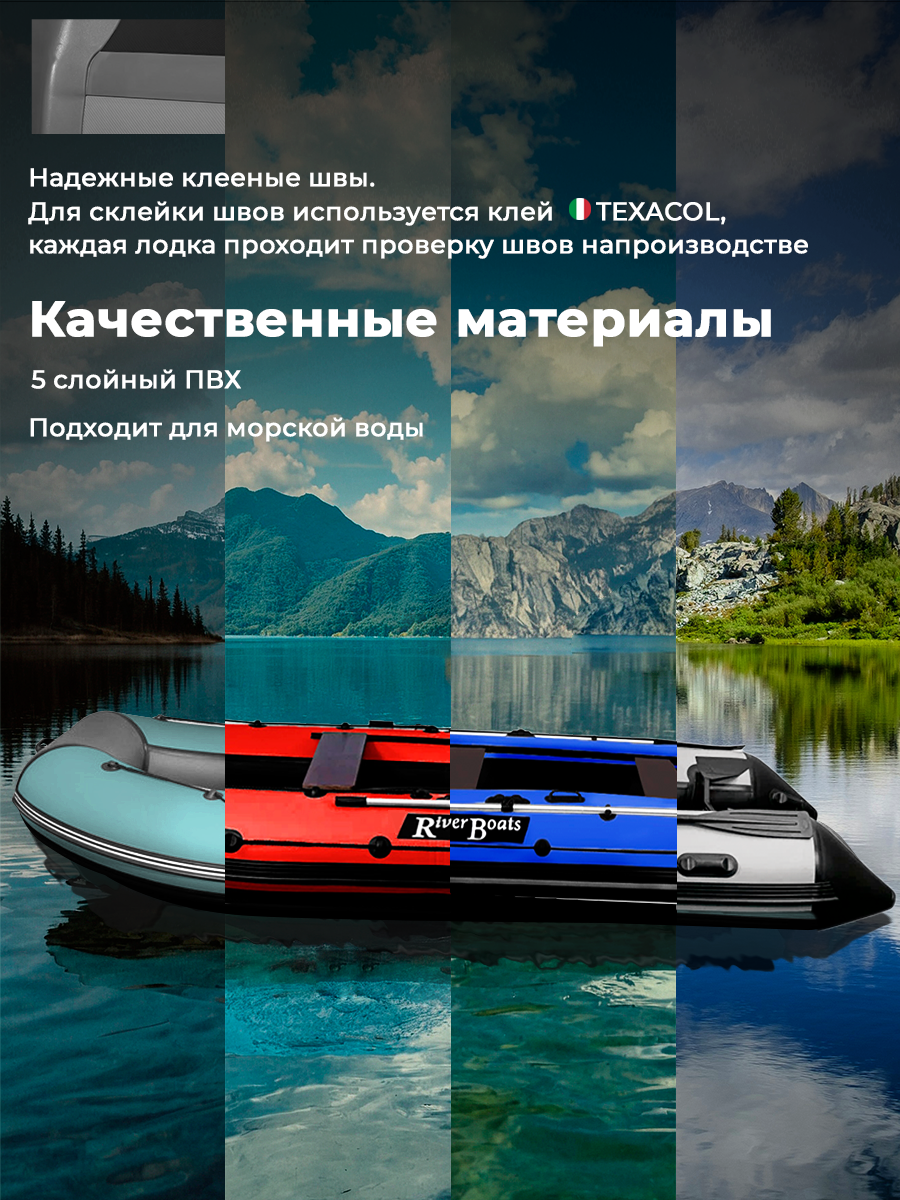 Конструкция лодок RiverBoats из ПВХ продумана до мелочей с учетом комфорта и безопасности. Баллоны разделены на герметичные отсеки, что позволяет лодке RiverBoats оставаться на плаву в случае повреждения одного из них.
