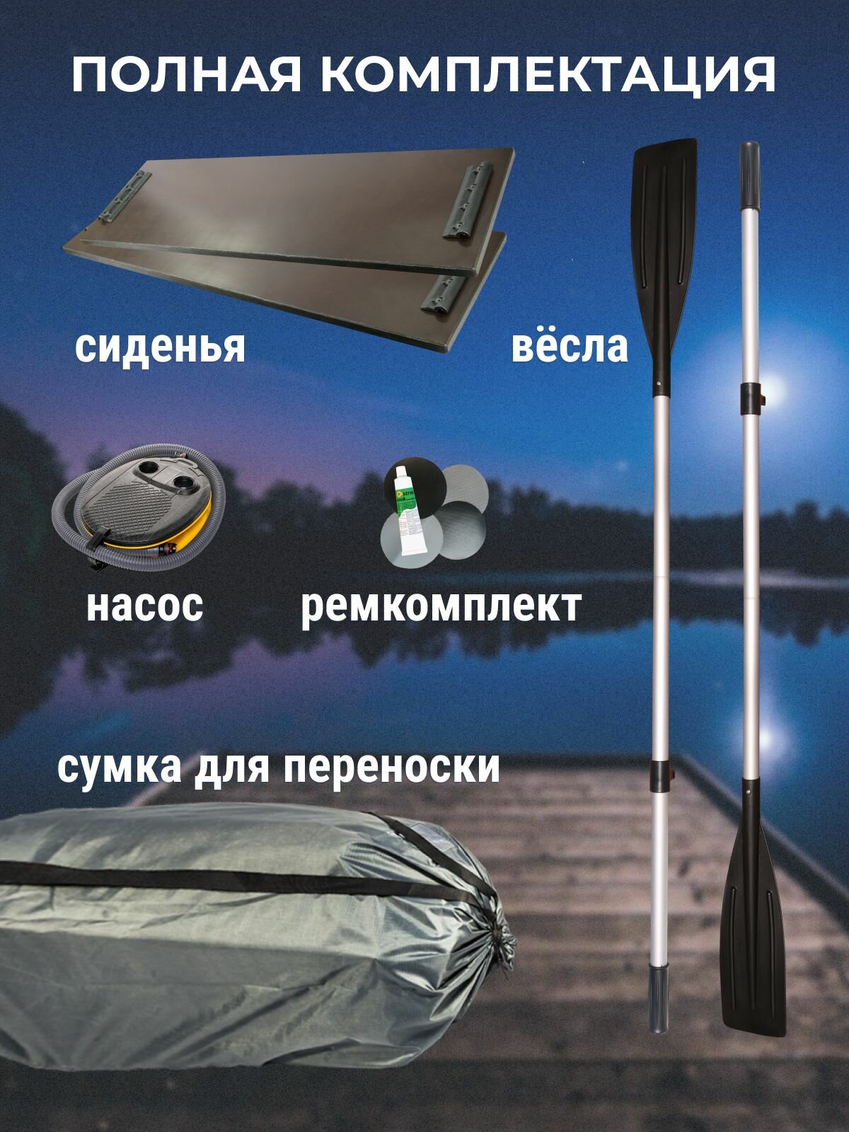 Облегчённые вёсла и регулируемые сиденья на ликтро-ликпазном креплении сделают Ваше пребывание на лодке максимально комфортным. Насос в комплекте позволяет быстро накачать и спустить лодку без особых усилий. Ремонтный комплект и удобная сумка-переноска обеспечивают сохранность и удобство транспортировки.