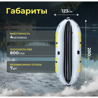 Лодка выполнена из ПВХ толщиной 0.6мм, что обеспечивает высокую прочность и долговечность изделия. Кроме того, она оснащена надувным дном, которое увеличивает комфорт и безопасность во время езды по волне. Лодка разделена на 7 независимых отсеков, что позволяет сохранять плавучесть и безопасность при повреждениях на воде.