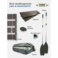| Комплектация | весла, жесткое сиденье, киль надувной, клапан для слива воды, леерный трос, насос, привальный брус, разборный пайол, ремкомплект, ручки для переноски, уключины, якорный рым |