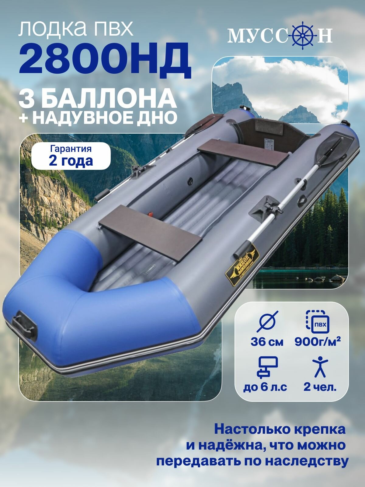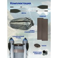 Модель Муссон 2800 снабжена двумя разборными вёслами, которые поставляются в отдельном чехле. Весла удобно крепятся по бокам надувных отсеков судна и фиксируются в рабочем положении на поворотных уключинах. Транец лодки в месте, предусмотренном для крепления мотора, защищен специальными пластиково-прорезиненными накладками.