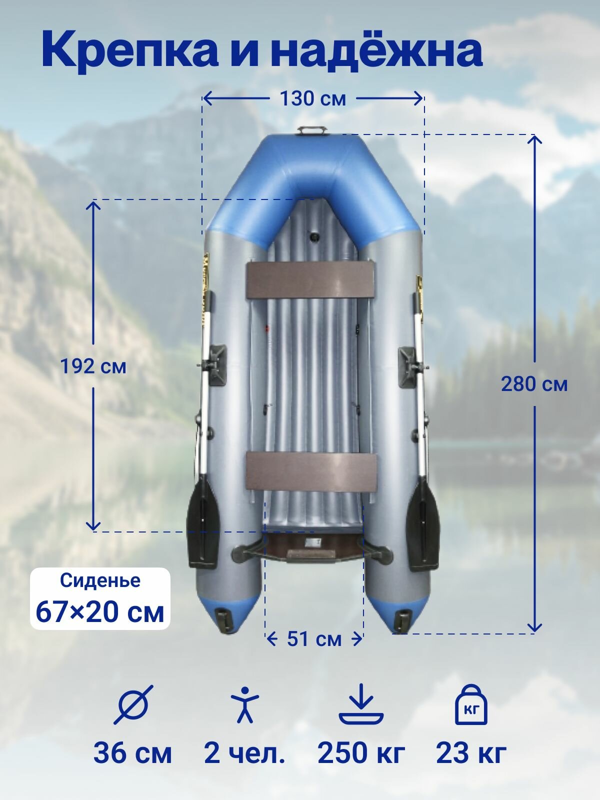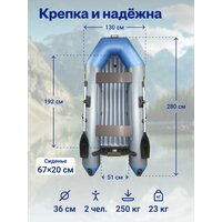 Надувное судно вмещает двоих пассажиров, а также рюкзак или снасть рыбака. Деревянные сиденья располагаются на креплении «ликтрос-ликпаз». Их расположение относительно друг друга можно с легкостью отрегулировать, установив на нужном расстоянии друг от друга.