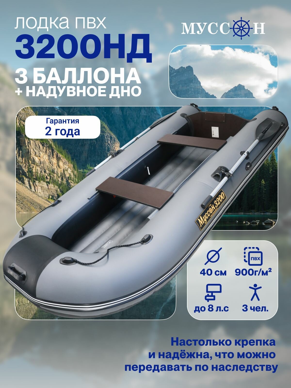 Надувная моторно-гребная ПВХ лодка Муссон 3200 НД сочетает в себе легкость и удобство сборки. Это отличный вариант для прогулок и отдыха на водоеме. Особенностью трехместной лодки под мотор, мощностью до 8 лошадиных сил, является наличие надувного дна, создающего комфорт пребывания в лодке и упрощающего сборку плавсредства.