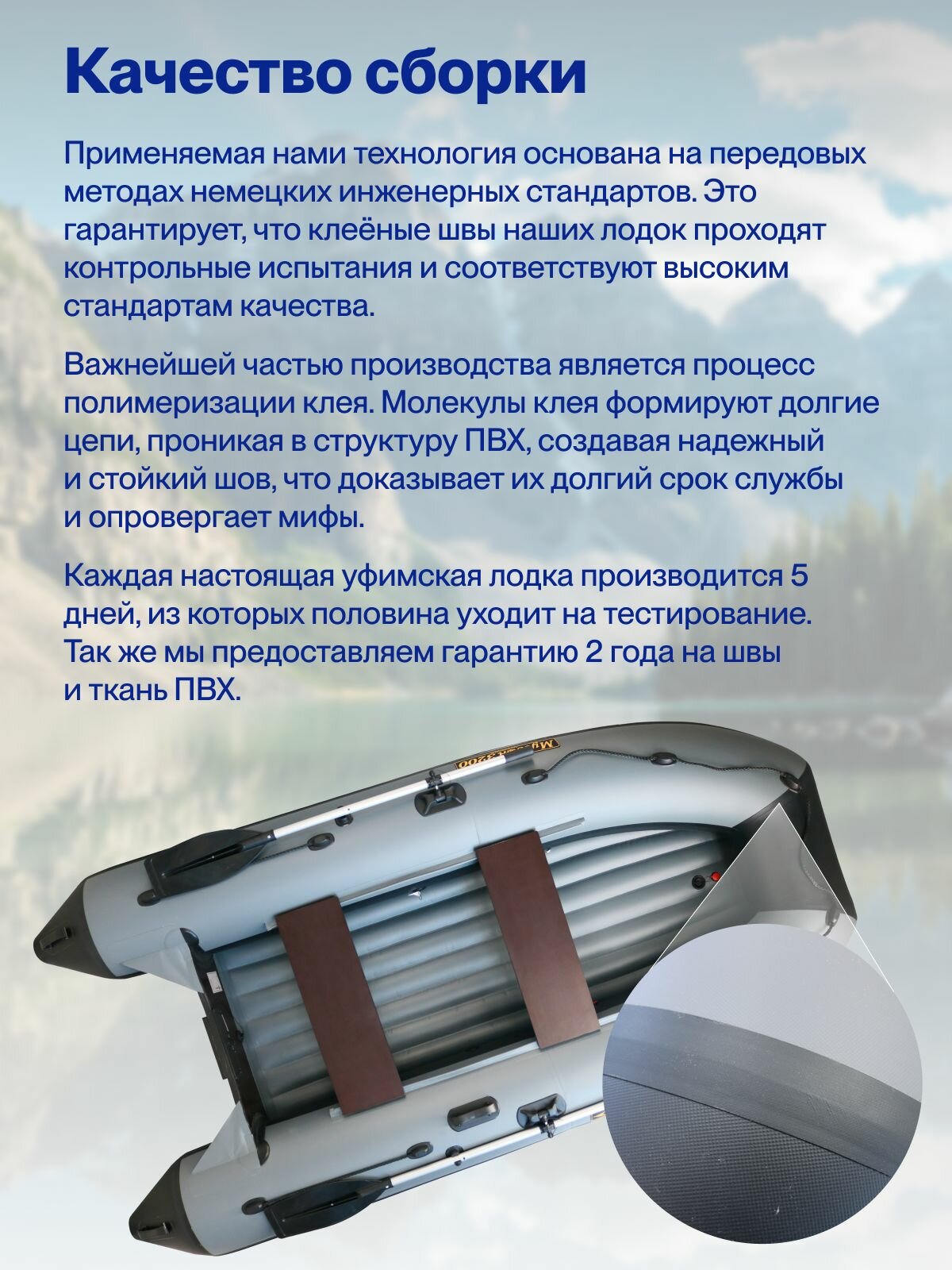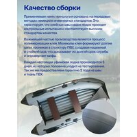Для установки лодочного мотора предусмотрен жесткий, стационарный транец из водостойкой фанеры. Он оснащен накладкой против истирания. Транец надежно проклеен с баллонами, крепится на трансхолдерах, защищен по кромке.