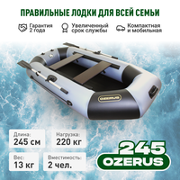 Купить Лодка ПВХ по мотор надувная для рыбалки OZERUS 245 + слань жесткий пол в комплекте, гребная двухместная , крепления под транец, серо-черная с доставкой по всей России.