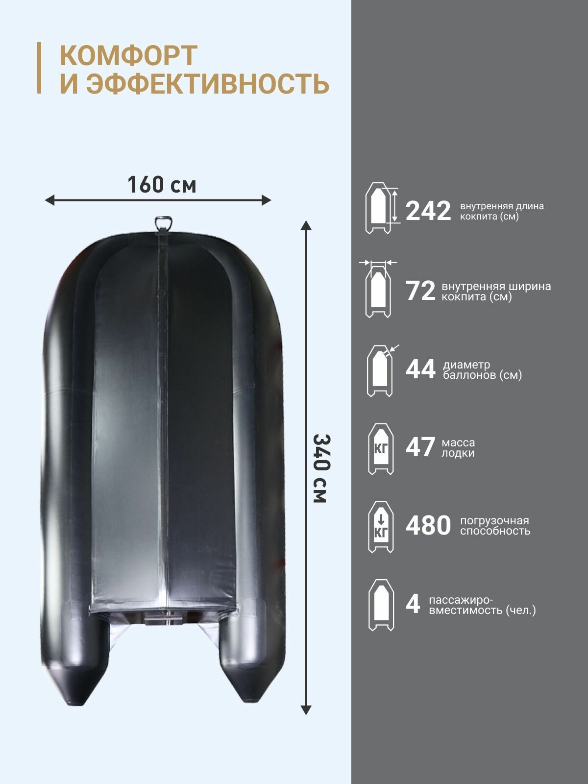 Лодка ПВХ "Лодки Поволжья 3400 СК" – идеальный выбор для рыбалки! Представляем вам надувную лодку ПВХ "Лодки Поволжья 3400 СК" — просторную и вместительную моторно-гребную лодку, которая станет вашим надежным спутником на рыбалке. Эта двухместная лодка пвх под мотор идеально подходит как для неспешной гребли, так и для скоростного передвижения при подключенном моторе. Грузоподъемность модели в 480 килограмм позволяет комфортно разместить до четырех пассажиров вместе с необходимым снаряжением. Благодаря стационарному транцу, вы можете установить мотор мощностью до 15 лошадиных сил, что быстро выведет вашу лодку пвх в режим глиссирования. Надувной киль обеспечивает отличную стабильность и безопасность во время маневров, делая эту лодку надувной для рыбалки идеальным выбором для активного отдыха на майские праздники с друзьями и семьей. Изготовленная из прочного поливинилхлорида с плотностью 850 г/м², эта лодка пвх обладает высокой износоустойчивостью к природным факторам. Судно состоит из трех надувных отсеков и киля, которые оснащены индивидуальными клапанами для подачи воздуха. Специальный предохранительный клапан предотвращает деформацию лодки, сбрасывая избыточное давление при накачивании. Разборная жесткая слань, соединяемая профилями и стрингерами, создает твердое основание для комфортного размещения пассажиров. Два деревянных сиденья можно регулировать по длине кокпита, обеспечивая максимальный комфорт во время рыбалки. Транспортировка лодки на воду упрощена благодаря специальным ручкам и леерам на носовой и кормовой частях. Бортовой привал с брызгоотбойником защитит вас от попадания воды, а специальный клапан позволит сливать воду из кокпита, поддерживая комфорт во время путешествия. Лодка пвх со сланью — это не только практичное, но и простое в эксплуатации средство передвижения, которое станет незаменимым атрибутом для туристов, рыбаков и охотников. Лодки пвх под мотор, такие как "Лодки Поволжья 3400 СК", гарантируют вам безопасность и комфорт во время ваших рыболовных приключений. Эта надувная лодка пвх для рыбалки доступна в стильном серо-синем цвете, который привлечет внимание и выделит вас среди других рыболовов. "Лодки Поволжья 3400 СК" — это надежный и функциональный выбор, который подарит вам настоящие удовольствия от рыбалки. Не упустите шанс сделать идеальный подарок для мужчины, друга, папы или дедушки! Эта лодка станет прекрасным вариантом подарка на день рождения, 9 мая или любой другой праздник для настоящего рыбака. Позвольте себе и своим близким наслаждаться увлекательными моментами на воде с лодкой пвх "Лодки Поволжья 3400 СК"!
