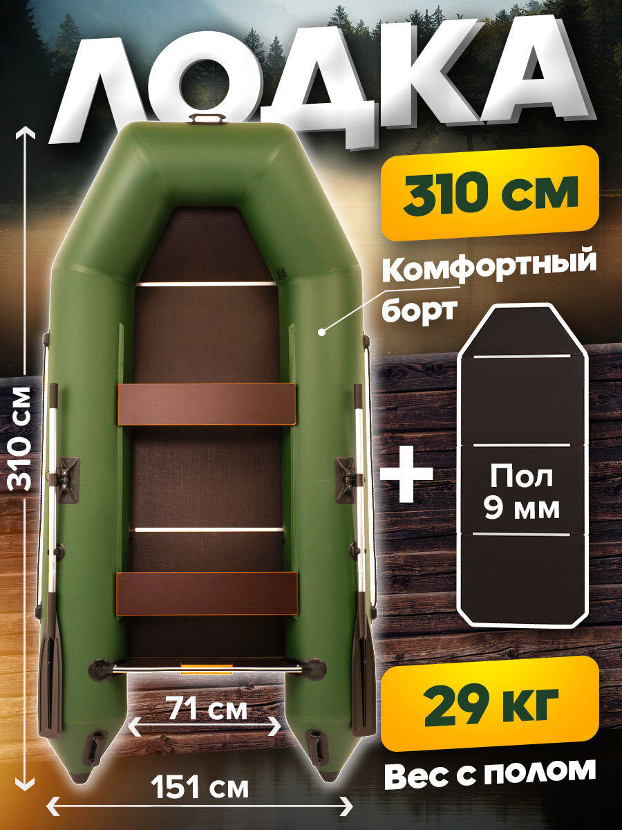 Лодка ПВХ под мотор с полом идеально подойдет для рыбалки. Комфортный размер 310*151 см не занимает много места, так как упаковывается в специальную сумку, которая идет в комплекте. Длина кокпита 215 см. Ширина кокпита 71 см. Оптимальный диаметр баллона 40 см. Лодка моторная имеет 3 надувных отсека. Внимание! Для накачивания лодки, чтобы воздух не выходил - поверните сердцевину клапана в рабочее состояние (фото с инструкцией в карточке товара и вкладыш в лодке). Передвижные сидения позволят удобно расположиться в лодке. Производство: Россия. Грузоподъемность 400 кг. Сварные швы. Прочный ПВХ 850 г/м2 выдержит любые испытания на воде. В комплекте так же насос 5л. и прочные 2 весла.