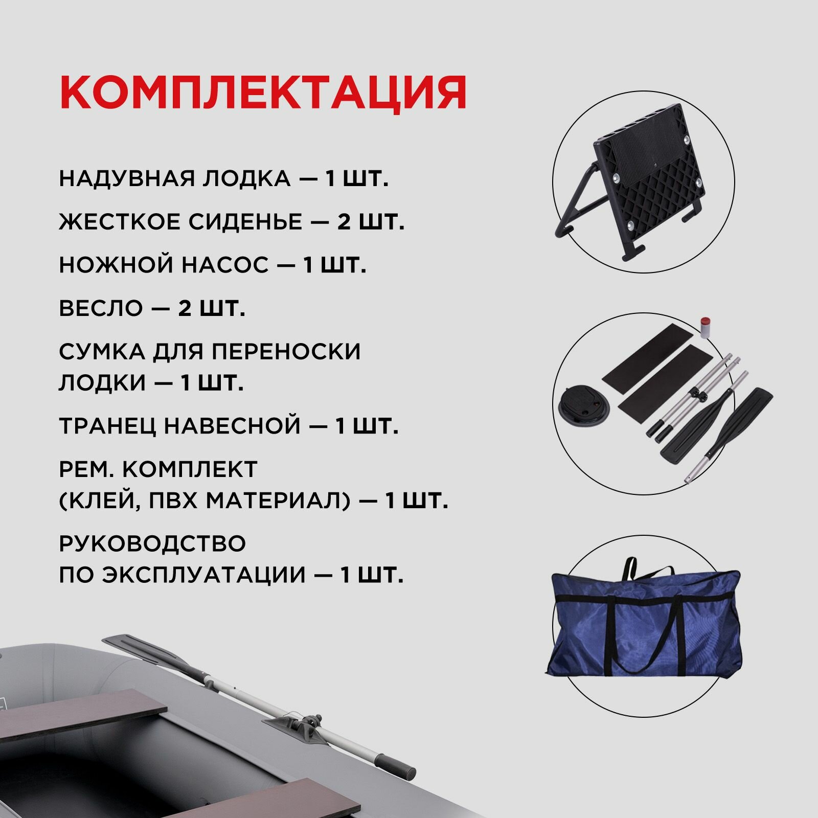 Комплектация: надувная лодка 1 шт, жесткое сиденье 2 шт, транец навесной - 1 шт, помпа ножная 1 шт, весло 2 шт, сумка для переноски 1 шт, ремонтный комплект (клей, ПВХ материал) 1 шт, руководство по эксплуатации 1 шт.
