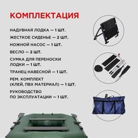 Комплектация: надувная лодка 1 шт, жесткое сиденье 2 шт, транец навесной - 1 шт, помпа ножная 1 шт, весло 2 шт, сумка для переноски 1 шт, ремонтный комплект (клей, ПВХ материал) 1 шт, руководство по эксплуатации 1 шт.