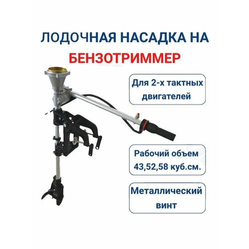 Насадка предназначена для использования с двигателем от бензотриммера ( бензокосы ). Подходит для работы с 2-х тактным двигателем от триммера с рекомендованным рабочим объемом 43/52/58cc. Винт металл Лодочная насадка на мотокосу / бензокосу / триммер ( дейдвуд , лодочный мотор )