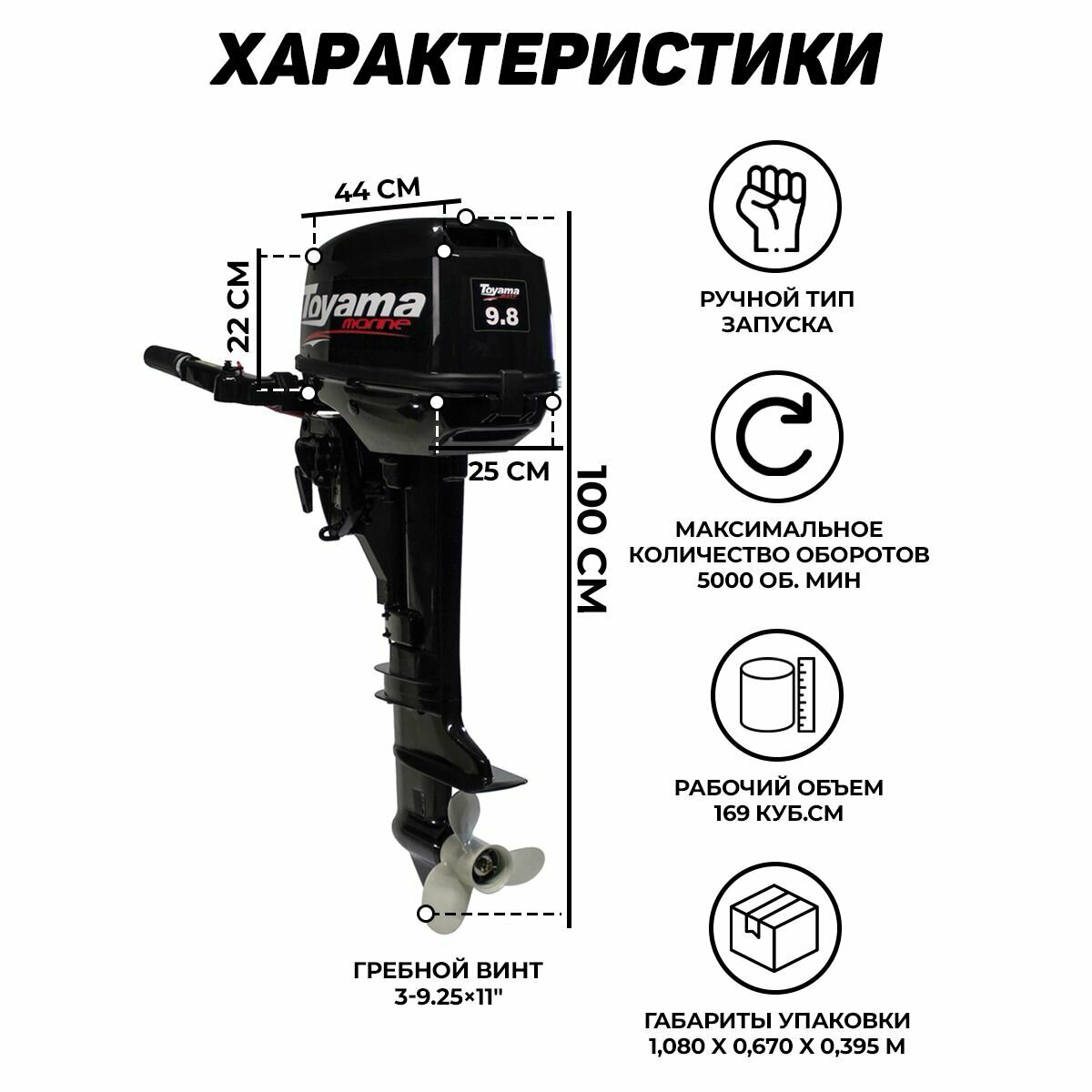 Лодочный мотор TOYAMA T9.8BMS — это надежный 2-тактный двигатель, который станет отличным выбором для рыбалки и отдыха на воде. С мощностью 9.8 л. с. и объемом 169 см³, этот мотор обеспечивает отличную производительность и универсальность использования. Его легкий вес в 26 кг делает его удобным в транспортировке и установке на различных типах лодок, включая надувные модели.