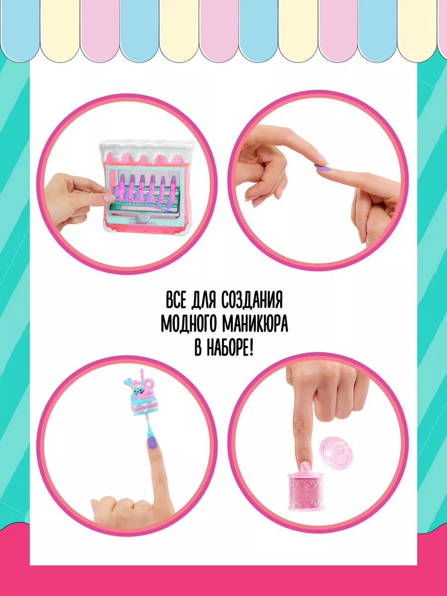 В игровом наборе ЛОЛ сюрпрайз ОМГ Свит Нейлс кукла, комплект одежды, обуви и модных аксессуаров для куклы, комплект накладных ногтей для девочки с клеевыми полосками (24 шт); 2 флакона лака, 1 флакон блесток, наклейки и пилочка для накладных ногтей. Для удобства нанесения лак имеет густую консистенцию. Для стирания лака с накладных ногтей не требуется жидкость для снятия лака – просто потрите поверхность накладного ногтя до полного стирания лака. Вы можете также использовать влажную ткань/салфетку для стирания лака. Игрушка изготовлена из полимерных материалов с элементами из текстиля. Товар сертифицирован и безопасен для детского использования. Упаковка: коробка с окном 25,5х7х30,5 см.