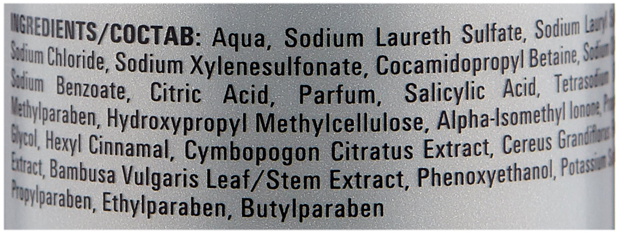 | Состав | aqua, sodium laureth sulfate, sodium lauryl sulfate, sodium chloride, sodium xylenesulfonate, cocamidopropyl betaine, sodium citrate, sodium benzoate, citric acid, parfum, salicylic acid, tetrasodium edta, methylparaben, hydroxypropyl methylcellulose, alpha-isomethyl ionone, propylene glycol, hexyl cinnamal, cymbopogon citratus extract, cereus grandiflorus flower extract, bambusa vulgaris leaf/stem extract, phenoxyethanol, potassium sorbate, propylparaben, ethylparaben, butylparaben |