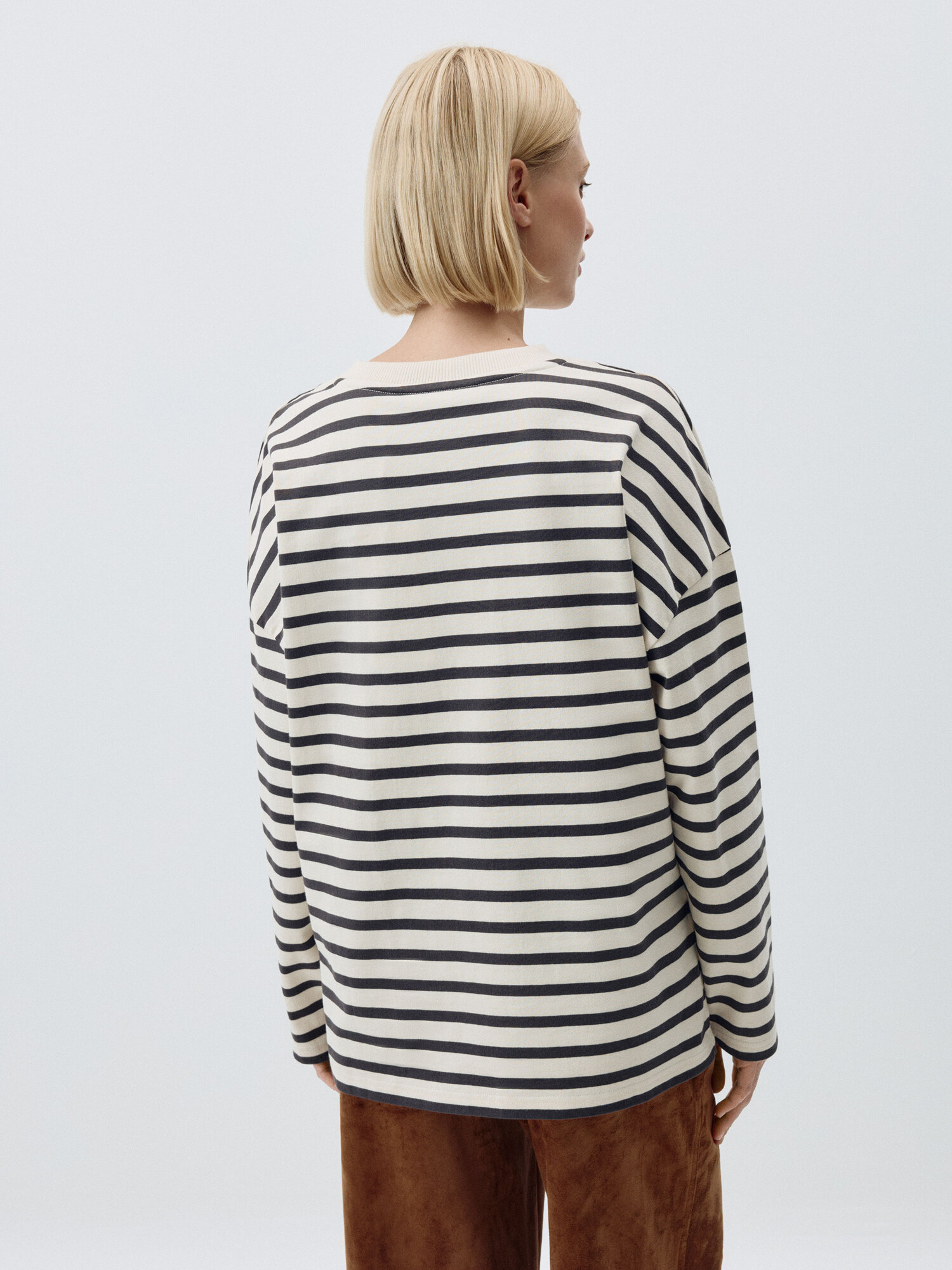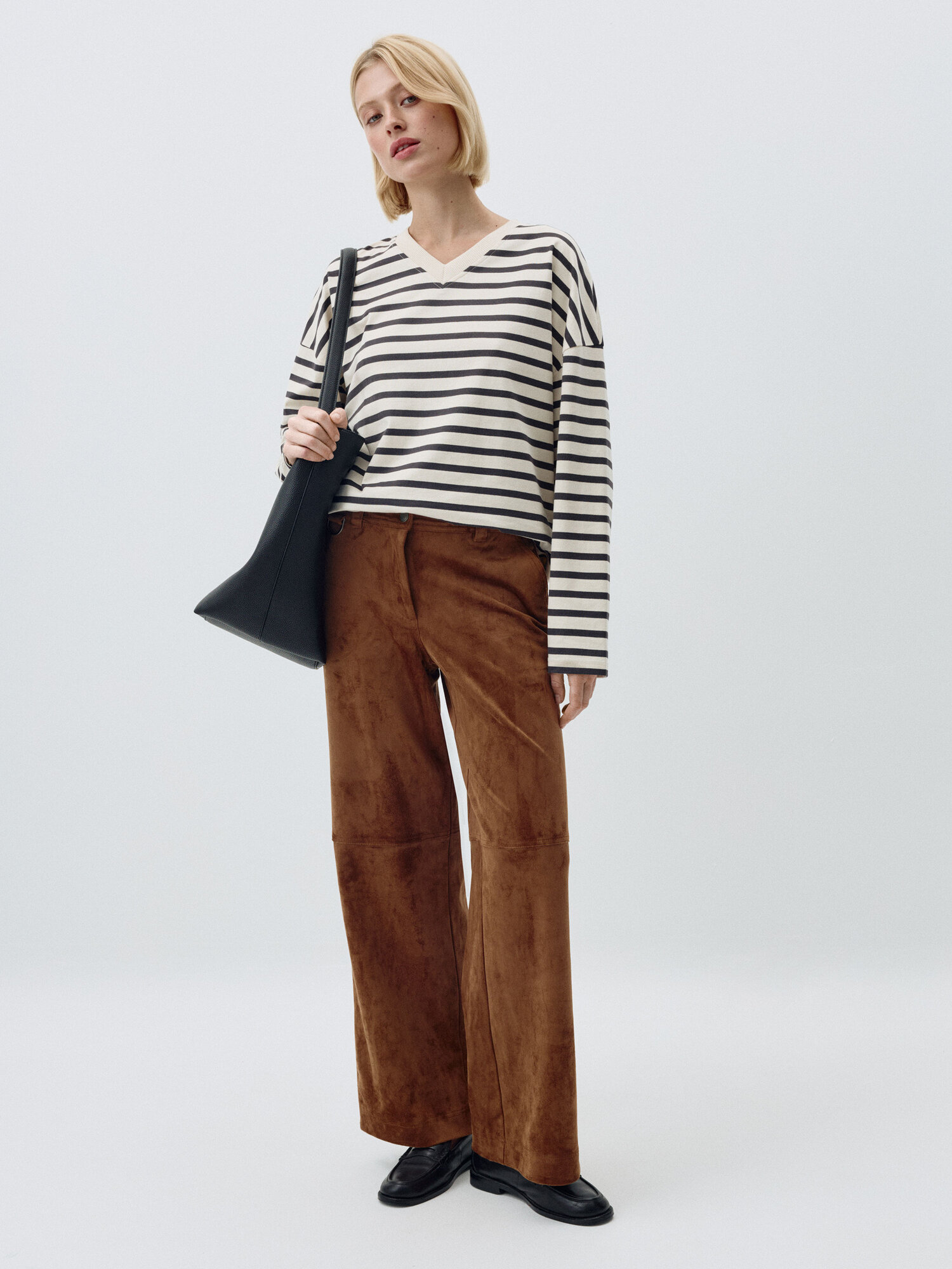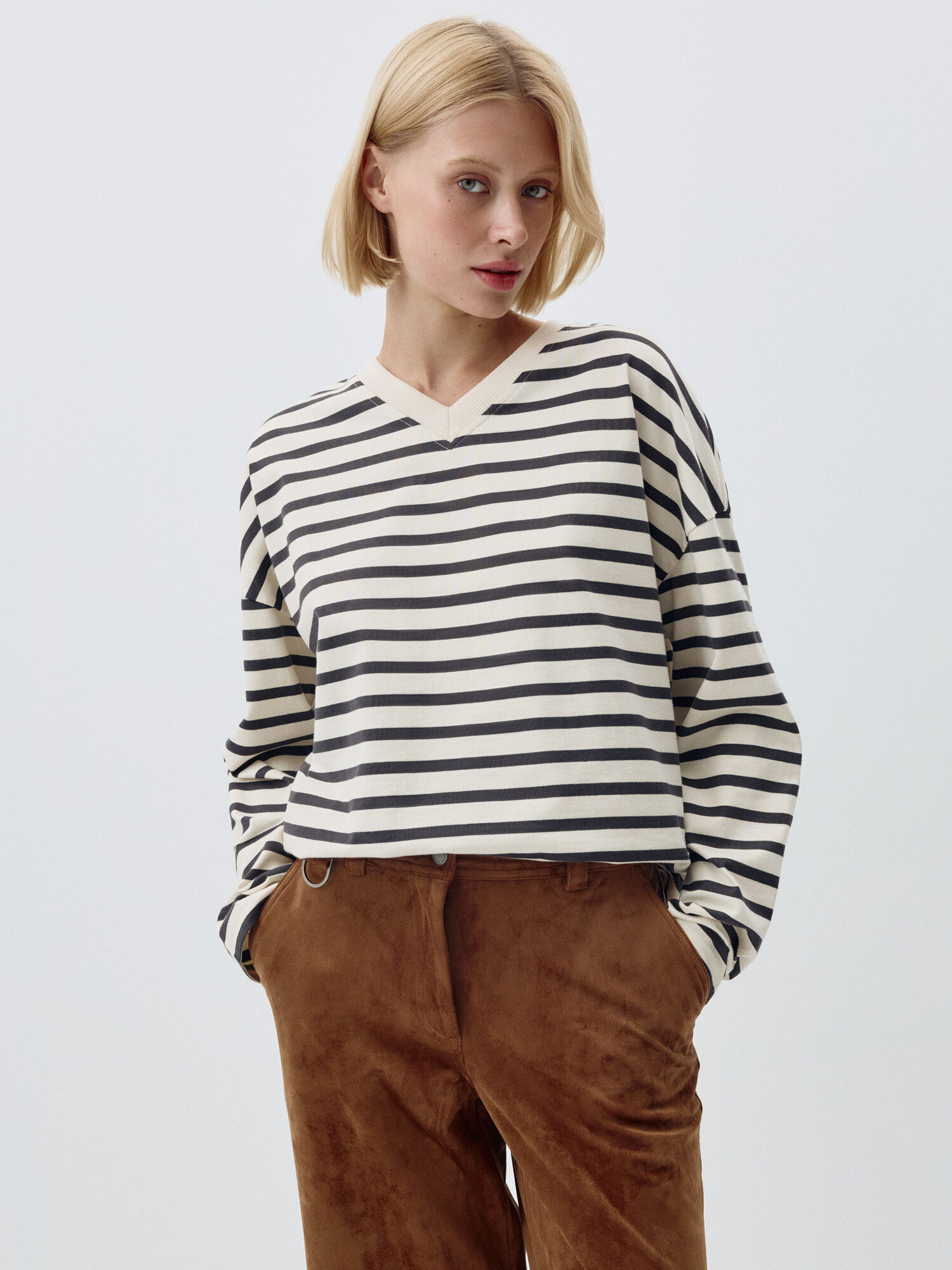 Оверсайз силуэт и V-образный вырез делают лонгслив удобным и комфортным для носки.