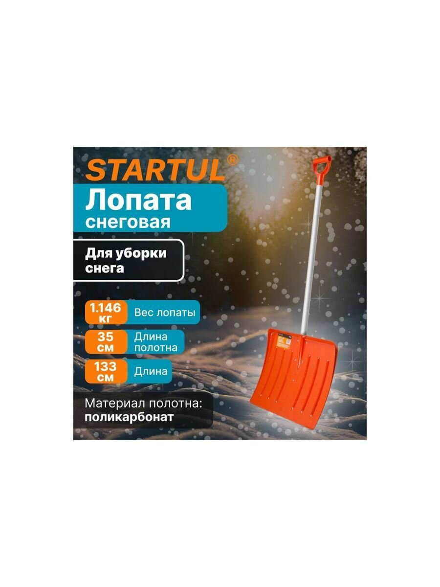 Лопата снеговая пластмассовая 410х350 мм STARTUL Profi (ST9057-1) с полотном, которое снабжено рёбрами жёсткости, в совокупности с прочным материалом, из которого изготовлена рабочая часть. Лопата выдерживает достаточно существенные нагрузки. Так как рабочая часть лопаты крепится к черенку под небольшим углом, лопата может быть использована по своему прямому назначению (уборка снега), так и в качестве скрепера. Поликарбонат - ударопрочный пластик. Именно этот вид пластика используется для изготовления рабочей части лопаты. Основные отличия поликарбоната и полипропилена в том, что поликарбонат более морозостойкий и в 12 раз прочнее. Поликарбонат не разрушается при перепадах температур, выдерживая от -60 С до +140 С. Кроме того, этот материал устойчив к воздействию солнечного света и других атмосферных воздействий. При изготовлении черенка используется алюминий, благодаря чему он отличается лёгкостью и прочностью. На конце лопаты D-образная эргономичная ручка, придающая ей дополнительную функциональность. Длина черенка 1 м.
