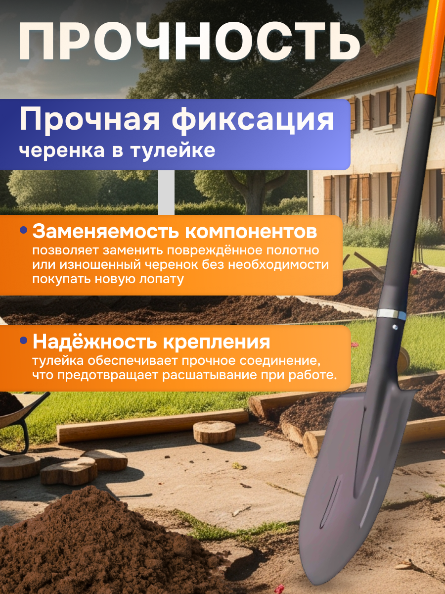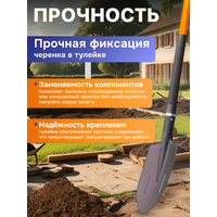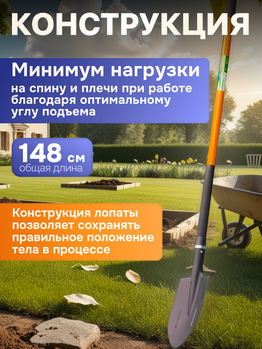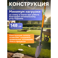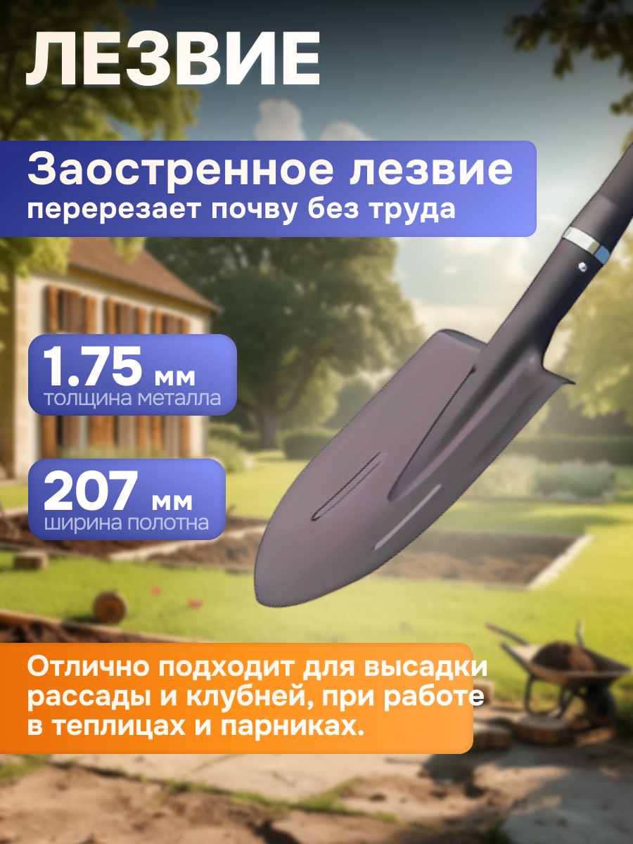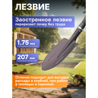 Копательная, с ребрами жесткости. Лезвие изготовлено из высокоуглеродистой закаленной стали с защитным антикоррозийным покрытием. Фиберглассовый черенок с прорезиненной рукояткой. Ширина полотна: 207мм, Высота полотна: 402 мм, Длина лопаты с черенком: 1480 мм. Толщина полотна 1,75мм