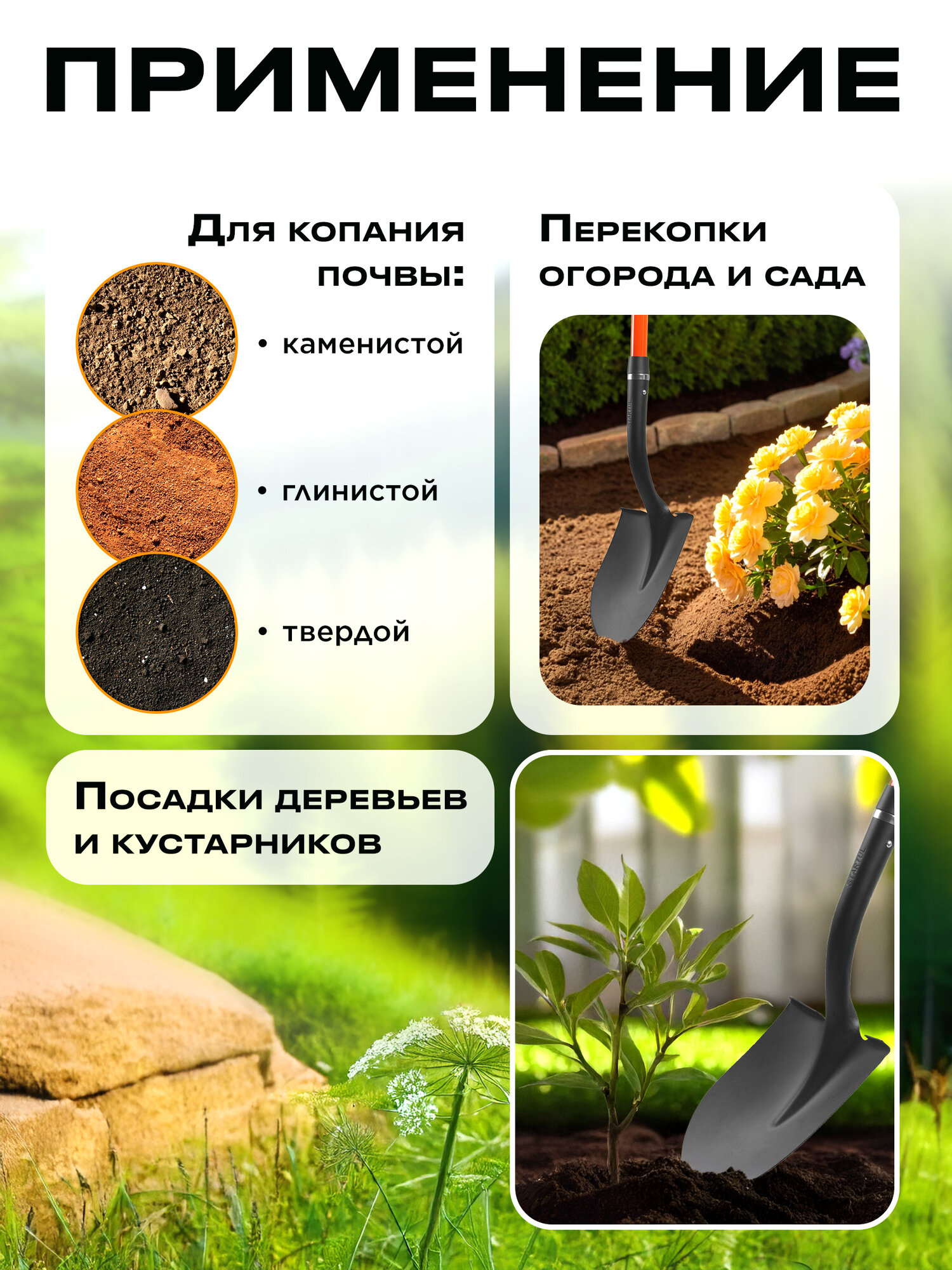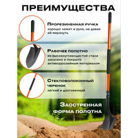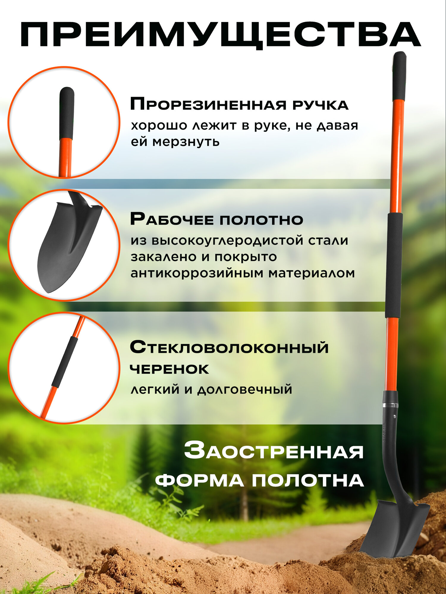 Удобная ручка: черенок лопаты выполнен из фибергласса, что обеспечивает комфортное и надежное удержание инструмента в руке. Общая длина инструмента составляет 148 см, что позволяет работать на большой глубине.