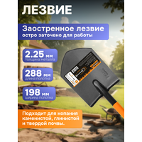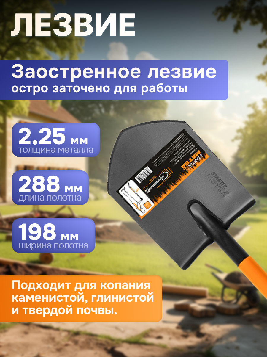 Лопата штыковая цельнометаллическая 1220 мм STARTUL METSA (ST6080-02) – ваш верный спутник при работе с каменистой, глинистой и твердой почвой. Эта лопата сделает вашу работу гораздо более эффективной благодаря своей прочной конструкции и удобству использования. Заточенное лезвие лопаты обеспечивает легкость копания и позволяет перерезать корни без усилий. Сварное соединение между лезвием и черенком обеспечивает надежность и долговечность инструмента. Эргономичная конструкция лопаты поддерживает правильное положение тела во время работы. Угол подъема в 26 градусов снижает нагрузку на спину и плечи, позволяя вам чувствовать себя комфортно даже после длительных сессий копания. Лопата имеет ширину полотна 198 мм, длину 288 мм и толщину металла 2.25 мм, что обеспечивает достаточную площадь для песка, почвы, гравия, щебня и другого сыпучего материала. Черенок выполнен из полой стали с пластиковым покрытием для удобного захвата. Общая длина лопаты составляет 1220 мм, диаметр черенка - 32 мм. D-образная рукоятка, расположенная к черенку под углом 17 градусов, обеспечивает удобный и естественный хват, который снижает нагрузку на вашу руку и позволяет справляться с задачами более эффективно. Подойдет для руки любого размера, для работы в перчатках или без. Вес лопаты составляет 2.12 кг, что обеспечивает идеальный баланс между прочностью и удобством использования. Лопата штыковая цельнометаллическая 1220 мм STARTUL METSA (ST6080-02) - надежный инструмент, который поможет вам справиться с самой сложной почвой и выполнить задачи в саду или на участке с минимальными усилиями. Многофункциональная лопата подходит для самых разнообразных видов работ, от садовых и строительных до туристических. Может использоваться как демисезонная совковая лопата для обработки почвы в саду, огороде, даче, для уборки снега, как походная или автомобильная. Хозяйственный инвентарь отлично подойдет для активного отдыха в лесу и дополнит любой туристический походный набор. Многофункциональность этого инструмента делает его незаменимым аксессуаром для отдыха, туризма, рыбалки и строительных или садовых работ на природе. STARTUL Garden прекрасная альтернатива таким фирмам как торнадика, спутник. Независимо от того, нужно ли вам работать в саду, на даче, в походе или заниматься другими видами деятельности, эта лопата прочной нержавеющей стали, всегда будет надежным и эффективным помощником.