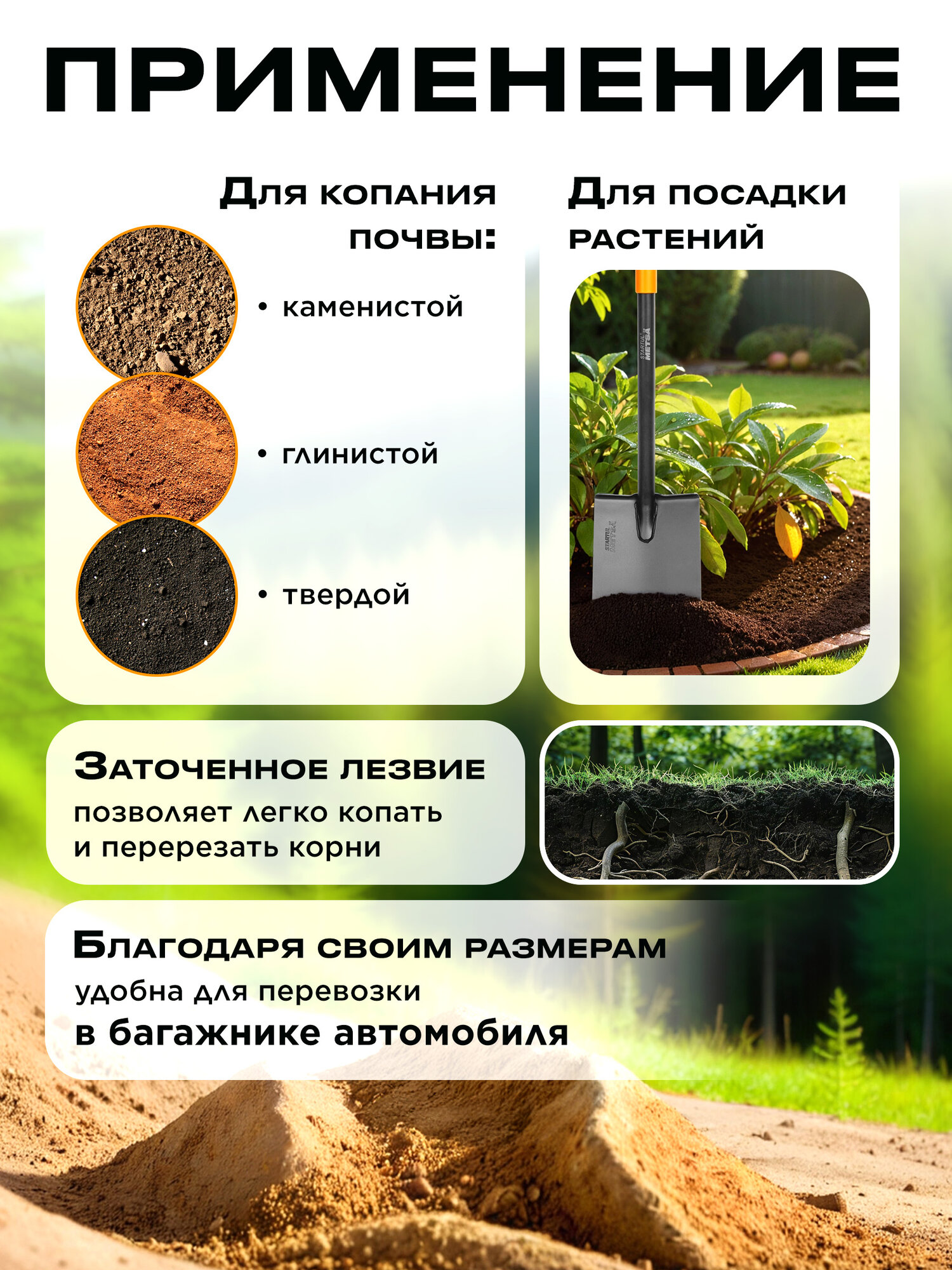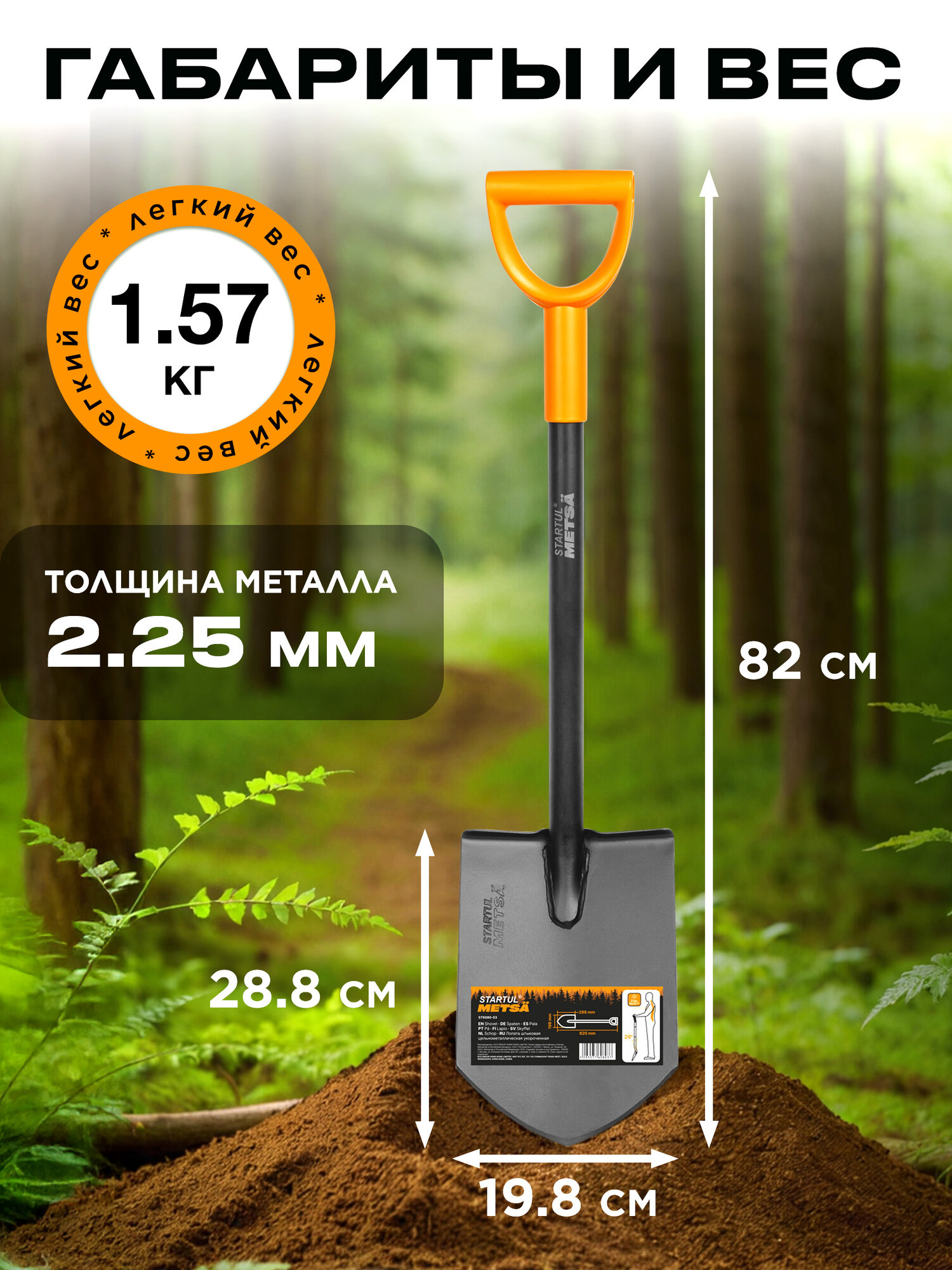 Лопата штыковая с черенком STARTUL METSA (ST6080-03) укороченная туристическая, автомобильная лопата отлично подойдет для активного отдыха в лесу и дополнит любой туристический походный набор, изделие удобно хранить и транспортировать в багажнике автомобиля. Заточенное лезвие позволяет легко копать и перерезать корни, подходит для копания каменистой, глинистой и твердой почвы. Сварное соединение между лезвием и черенком обеспечивает прочность инструмента. Рабочее полотно изготовлено из плотной высокоуглеродистой стали закалено и покрыто антикоррозионным материалом, что придает лопате дополнительную жесткость. Прочное лезвие легко проникает в грунт, позволяя легко копать и перерезать корни. С инструментами STARTUL Garden легко вскопать почву для посадки и пересадки растений, рыхление почвы и удаление сорняков, подготовиться к строительным работам с песком и бетоном. Полый стальной черенок оснащен эргономичной рукояткой в форме буквы D, это обеспечивает комфортный захват. Ручка подойдет для руки любого размера, для работы в перчатках или без. Угол подъема в 26 градусов минимизирует нагрузку на спину и плечи. D-образная ручка, расположенная к черенку под углом 17 градусов, гарантирует удобный и естественный хват. Ширина рабочего полотна 19 мм, длина 288 обеспечивает достаточную площадь для песка, почвы, гравия, щебня и другого сыпучего материала. Черенок полый стальной диаметром 32 мм. Оптимальная толщина металла 2,25 мм обеспечивает идеальный баланс между прочностью и весом 1,5. Цельнометаллический хозяйственный инструмент подходит для копания лёгких почв (рыхлые, песчаные, супесчаные). Универсальный походный инструмент для обработки почвы используется как садовый или строительный инвентарь. Многофункциональная автомобильная лопата подходит для самых разнообразных видов работ, от садовых и строительных до туристических. Может использоваться как демисезонная совковая лопата для обработки почвы в саду, огороде, даче, для уборки снега, как походная или автомобильная. Многофункциональность этого инструмента делает его незаменимым аксессуаром для отдыха, туризма, рыбалки и строительных или садовых работ на природе. STARTUL Garden прекрасная альтернатива таким фирмам как торнадика, спутник. Независимо от того, нужно ли вам работать в саду, на даче, в походе или заниматься другими видами деятельности, эта лопата из прочной нержавеющей стали, всегда будет надежным и эффективным помощником.