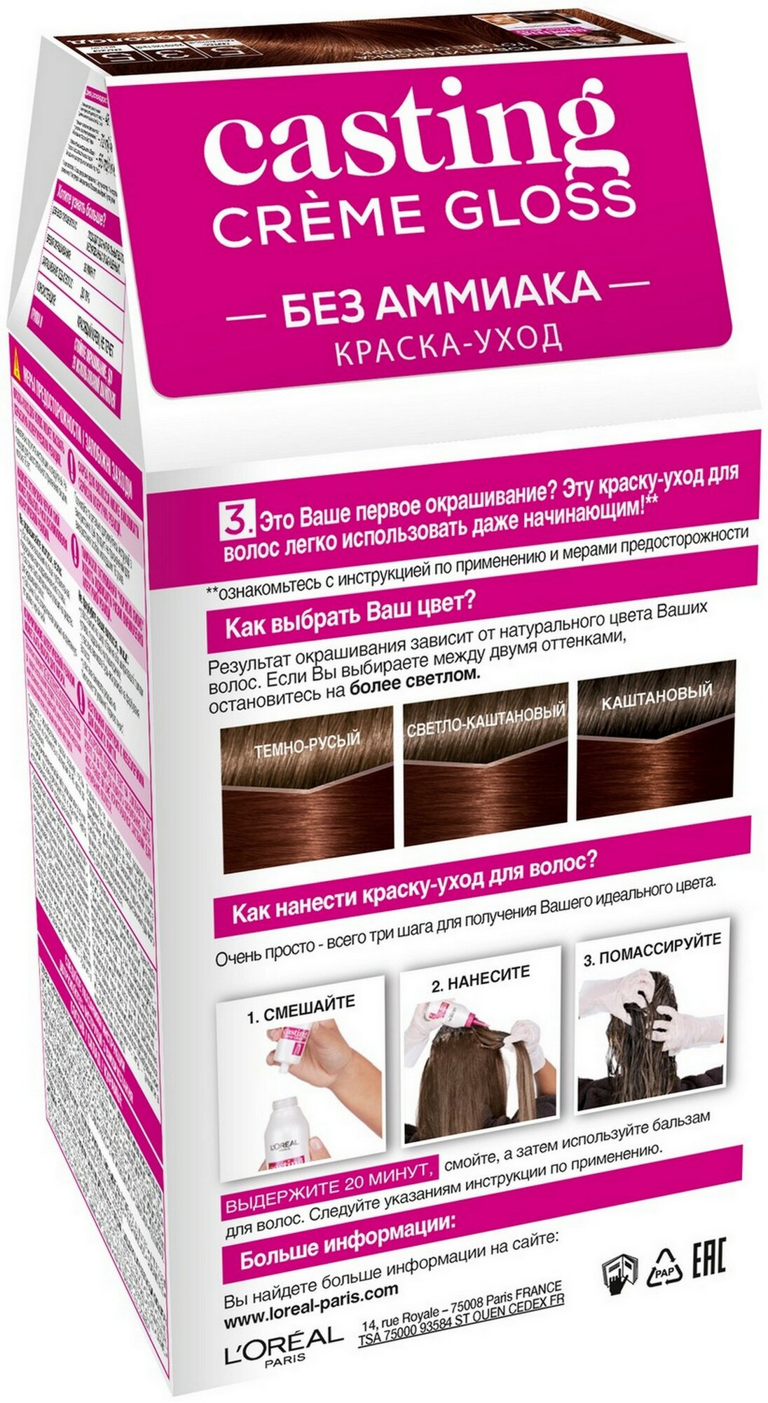 | Состав | aqua (water), cetearyl alcohol, propylene glycol, deceth-3, laureth-12, ethanolamine, oleth-30, lauric acid, toluene-2,5-diamine, polyquaternium-6, glycol distearate, resorcinol, hexadimethrine chloride, silica dimethyl silylate [nano] (silica dimethyl silylate), ci 77491 (iron oxides), ci 77891 (titanium dioxide), 2,4-diaminophenoxyethanol hcl, m-aminophenol, ascorbic acid, mica, sodium metabisulfite, thioglycerin, 2-methylresorcinol, carbomer, edta, parfum (fragrance), проявляющее молочко: aqua (water), hydrogenperoxide, cetearylalcohol, sodiumsalicylate, trideceth-2 carboxamide mea, phosphoric acid, ceteareth-25, tetrasodium etidronate, tetrasodium pyrophosphate, glycerin, бальзам для волос с маслом кокоса: aqua (water), cetearyl alcohol, behentrimonium chloride, elaeis guineensis oil (palm oil), glycerin, parfum (fragrance), cocos nucifera oil (coconut oil), hydroxyethylcellulose, phenoxyethanol, stearamidopropyl dimethylamine, isopropyl alcohol, octyldodecanol, citric acid |