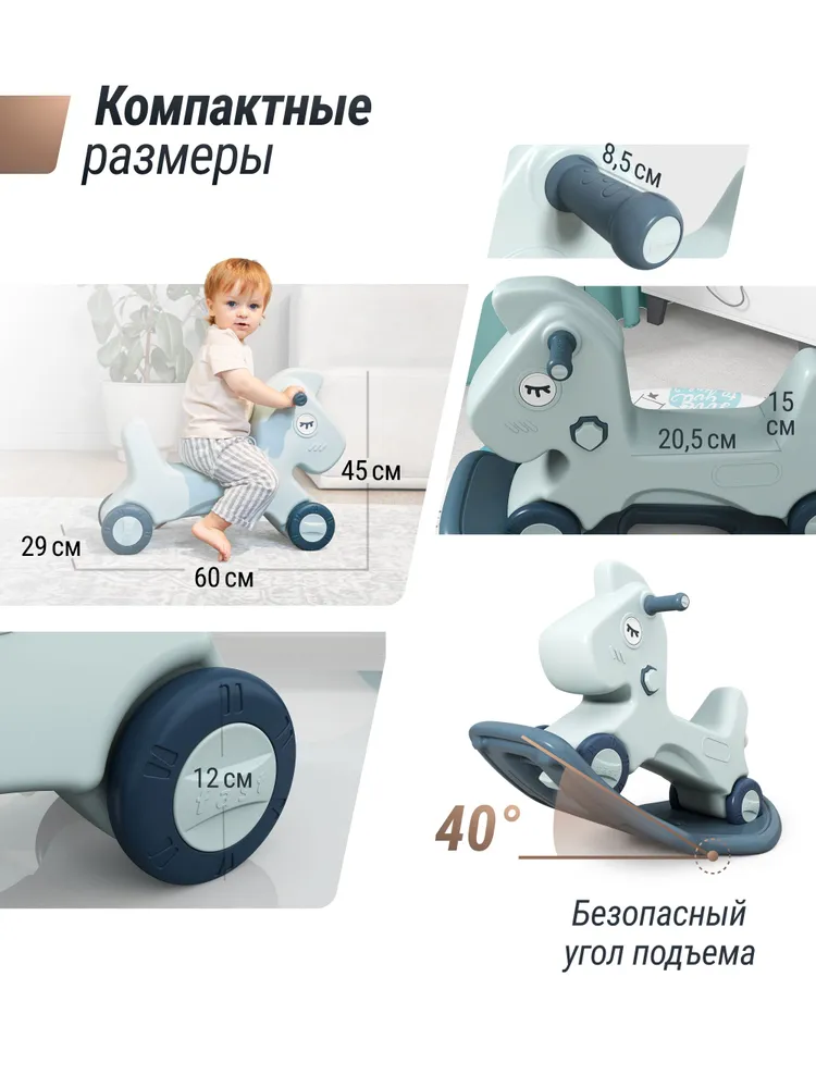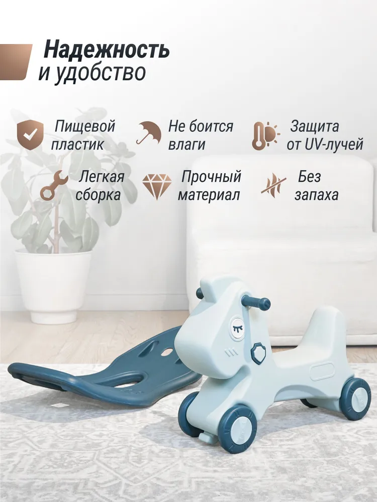 Лошадка изготовлена из пищевого пластика 4-го класса - согласно классификации ГОСТ, гипоаллергенного и абсолютно безвредного даже для самых маленьких пользователей