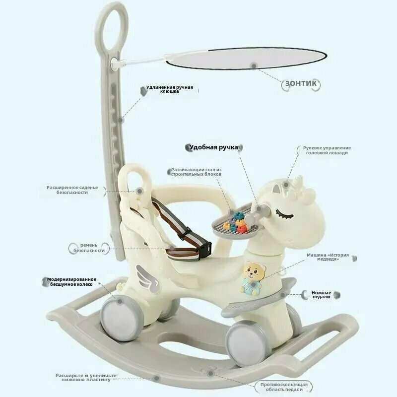 Лошадка-качалка-каталка с ручкой для детей и беговел, для дома и улицы, 76х40х60(98) см, белая: сравнение цен, характеристики, фото, актуальное наличие и цены.