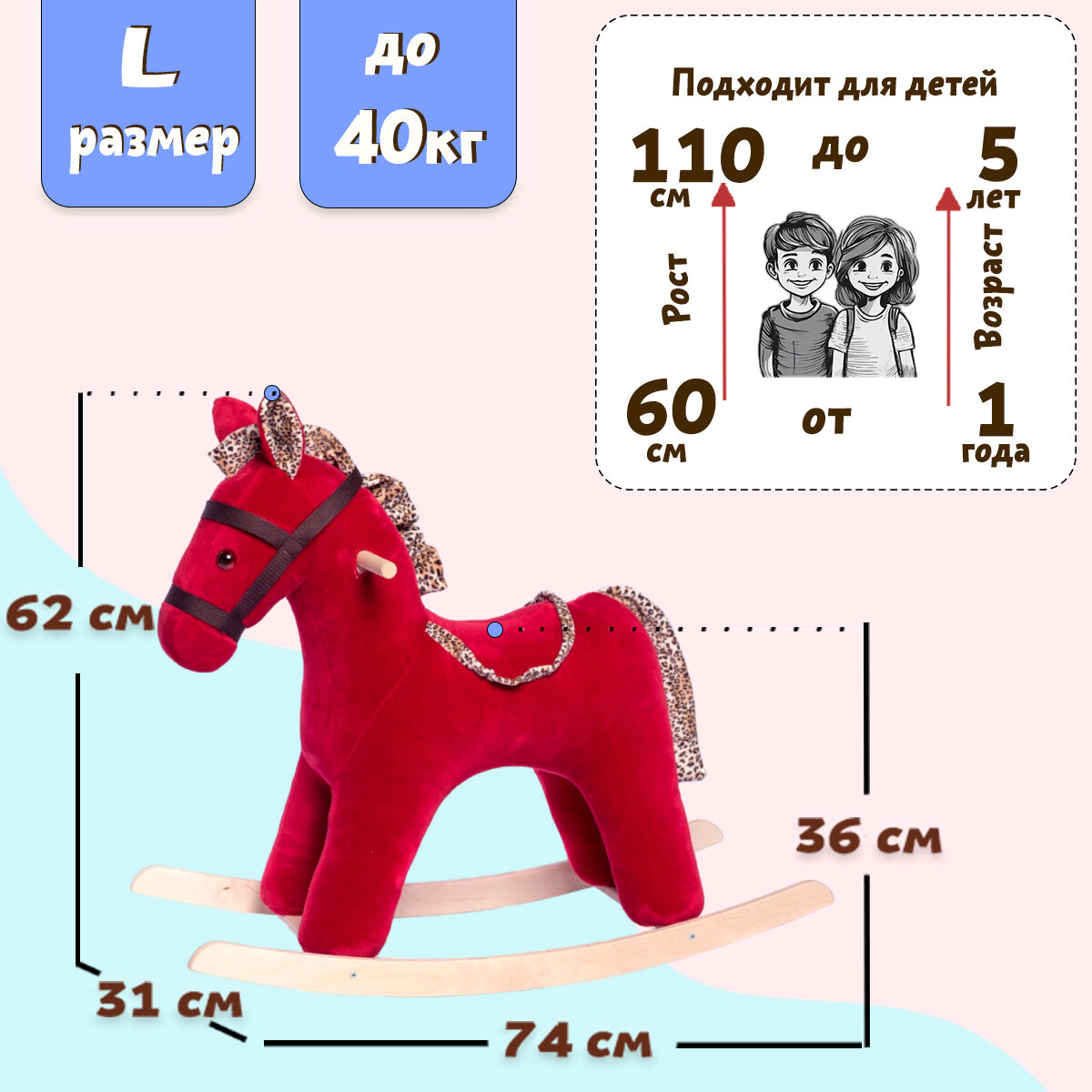 Конструкция качалки разработана таким образом, что она устойчива и безопасна для детей. Максимальная нагрузка составляет 40 кг. Высота от пола до сидения - 40см. Размер в собранном виде: 75*32*57 см. Сделано в России.