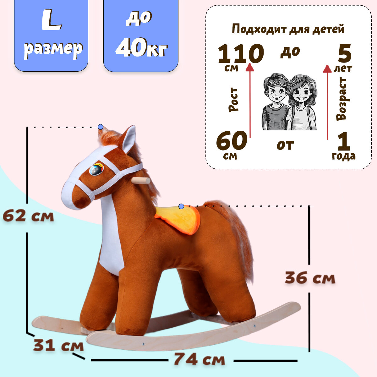 Качалка выполнена из безопасных материалов и имеет максимальную нагрузку в 40 кг. Она устойчива, что обеспечивает безопасность ребенка. Высота сидения от пола составляет 40 см, а размеры игрушки в собранном состоянии - 75x32x57 см.
