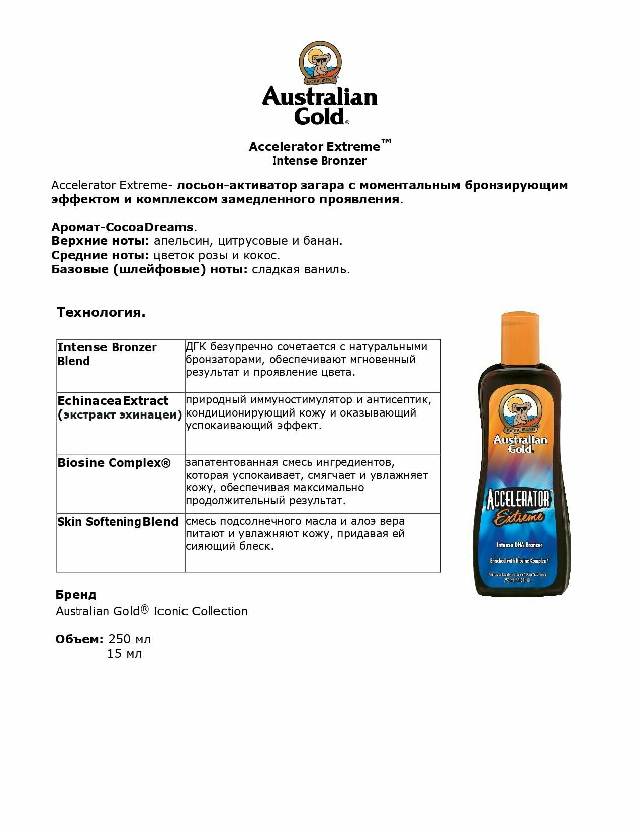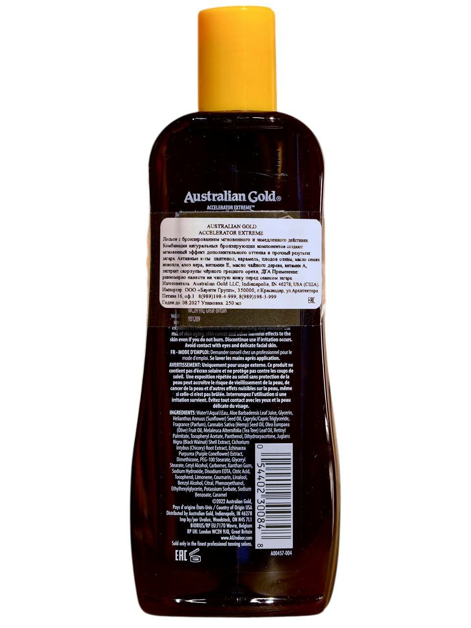 Лосьон-активатор загара Australian Gold Accelerator Extreme - это профессиональное средство для автозагара и солярия, которое обеспечивает моментальный бронзирующий эффект и комплекс замедленного проявления.