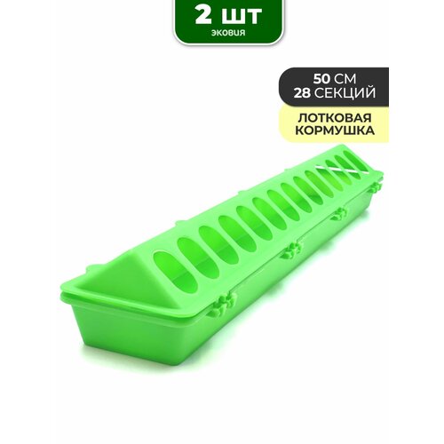 Лотковая кормушка для цыплят и кур сделана из пластика зелёного цвета. Пластик - легкий, прочный и устойчивый материал, который легко поддерживать в чистоте. Может использоваться под сухой или влажный корм, а также для подкормок. Снизьте разброс и потерю корма благодаря индивидуальным отверстиям. Подходит для цыплят и маленьких птиц. Длина: 50 см, ширина: 8 см