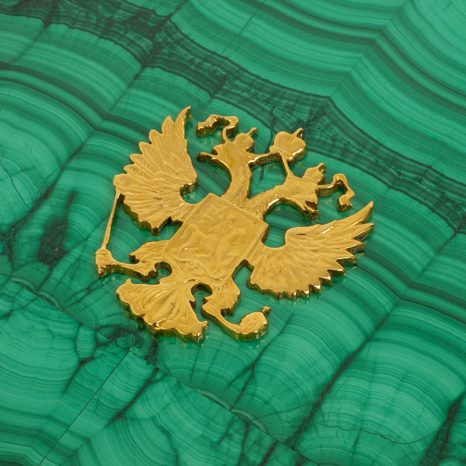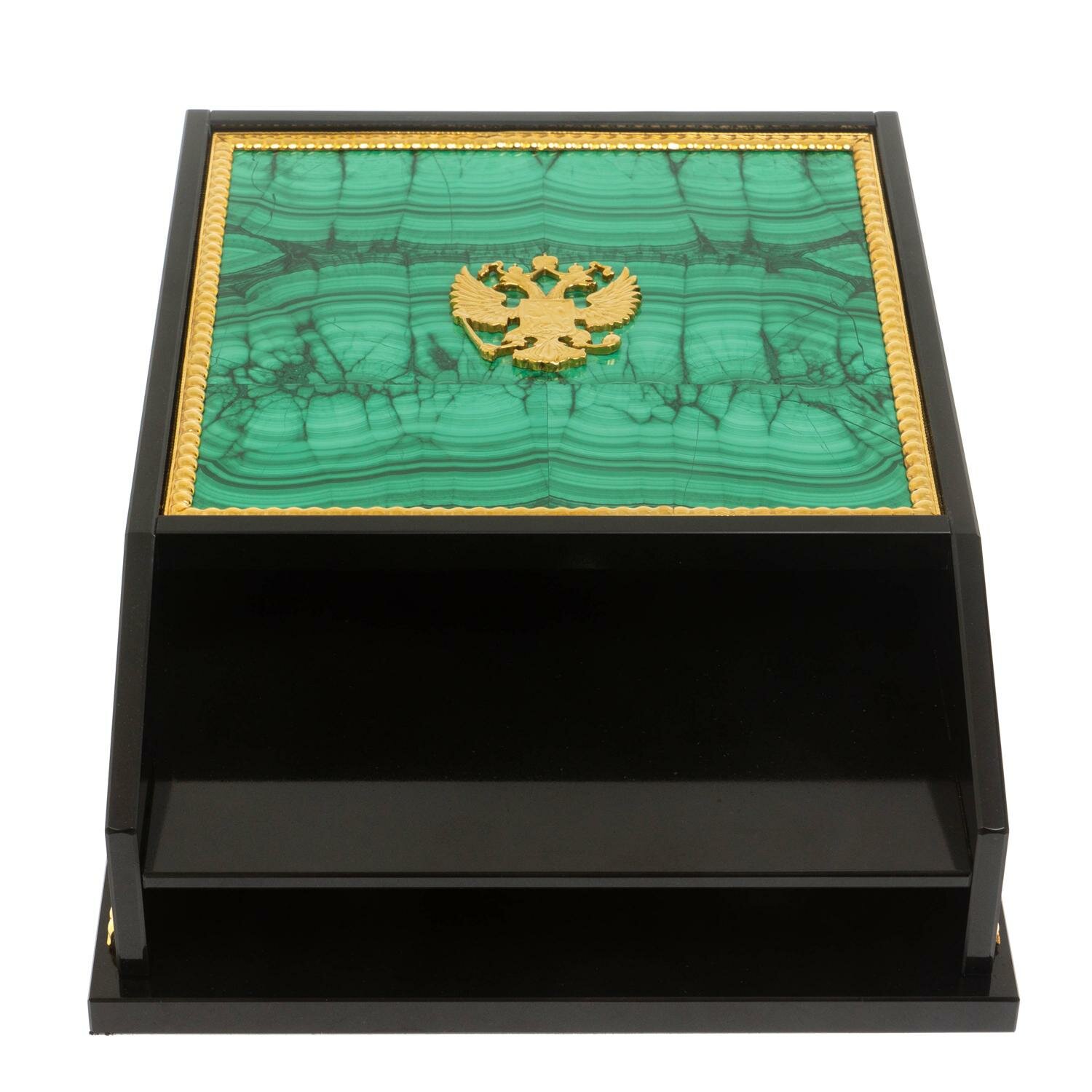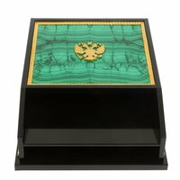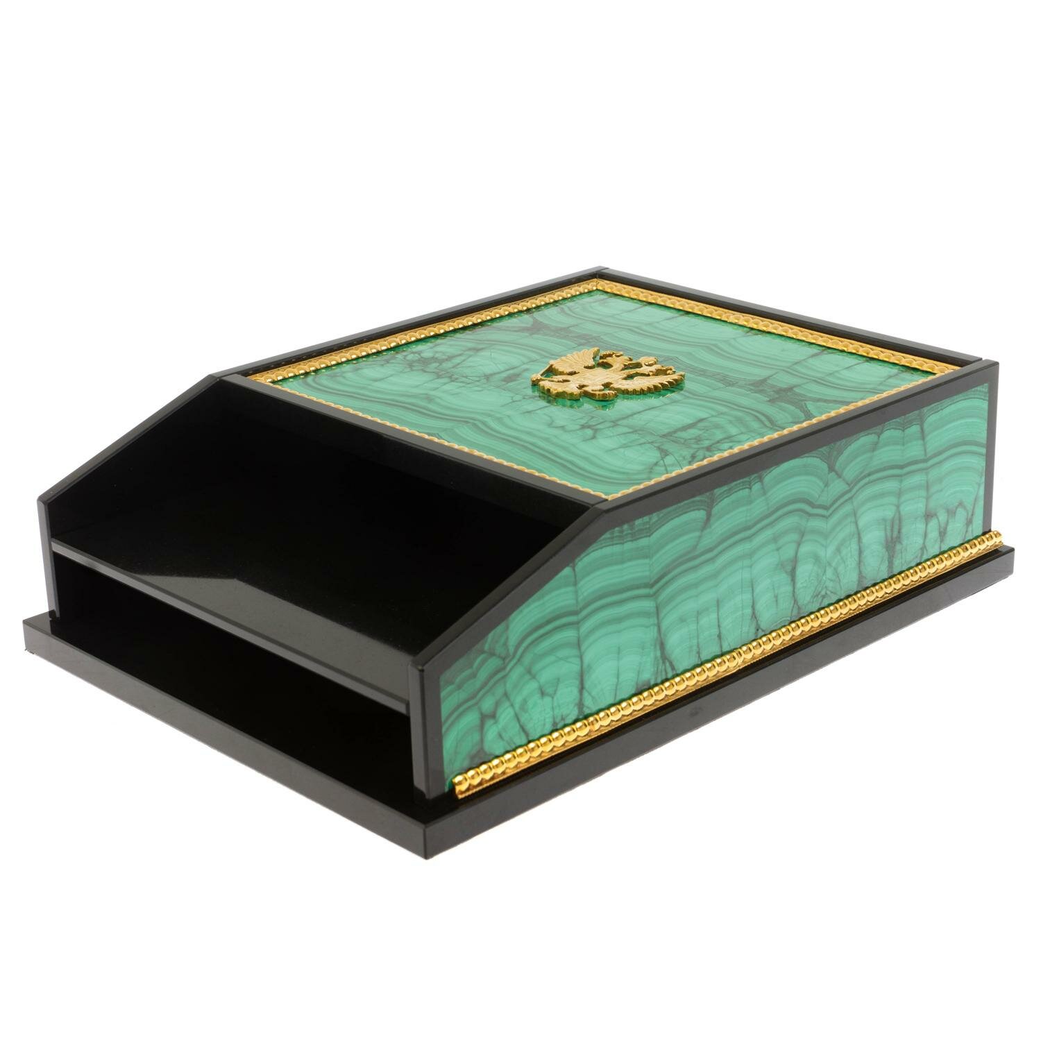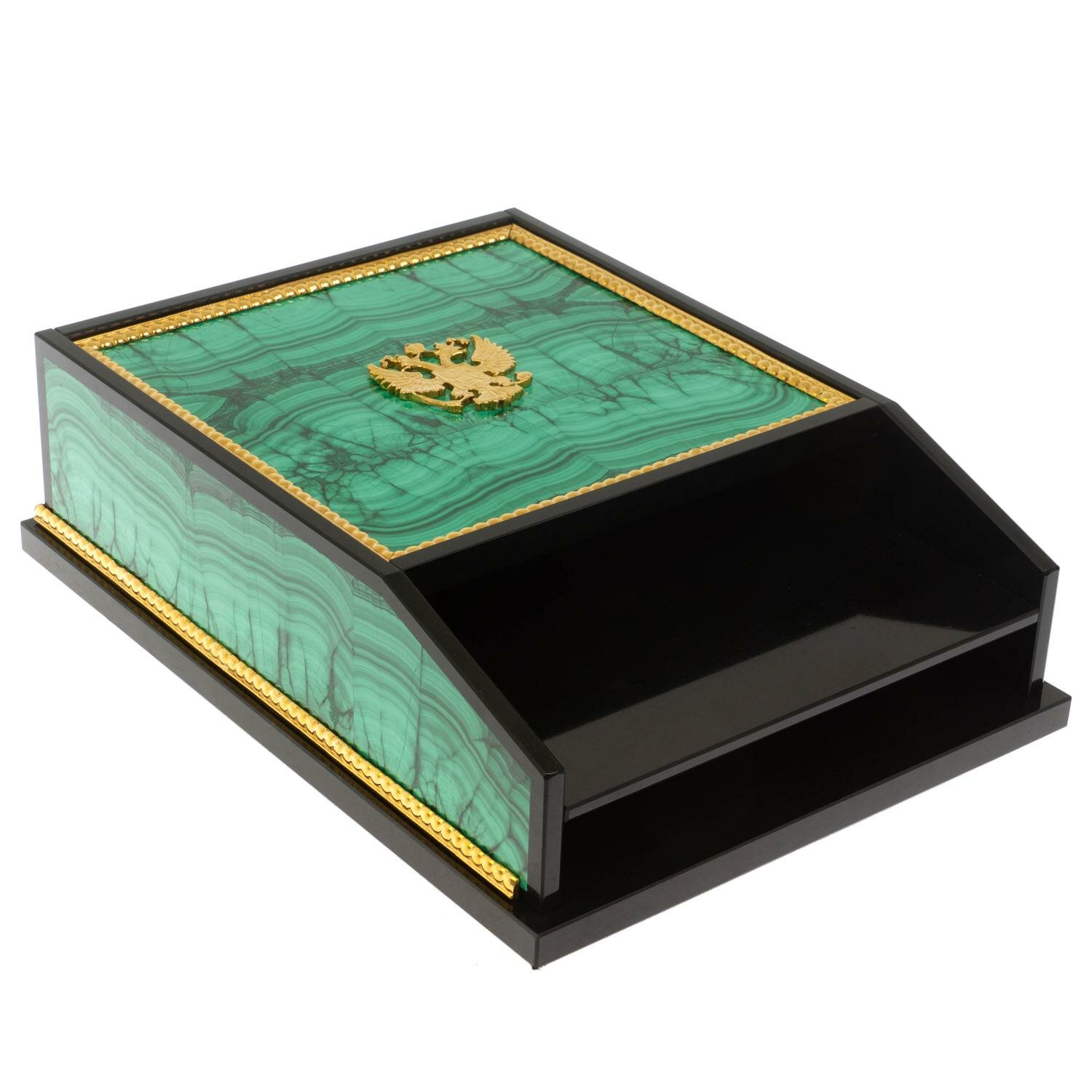 Лоток для бумаг А4 из малахита с гербом РФ двухъярусный размером 24,5х32х9,5 см и весом 10000 г.