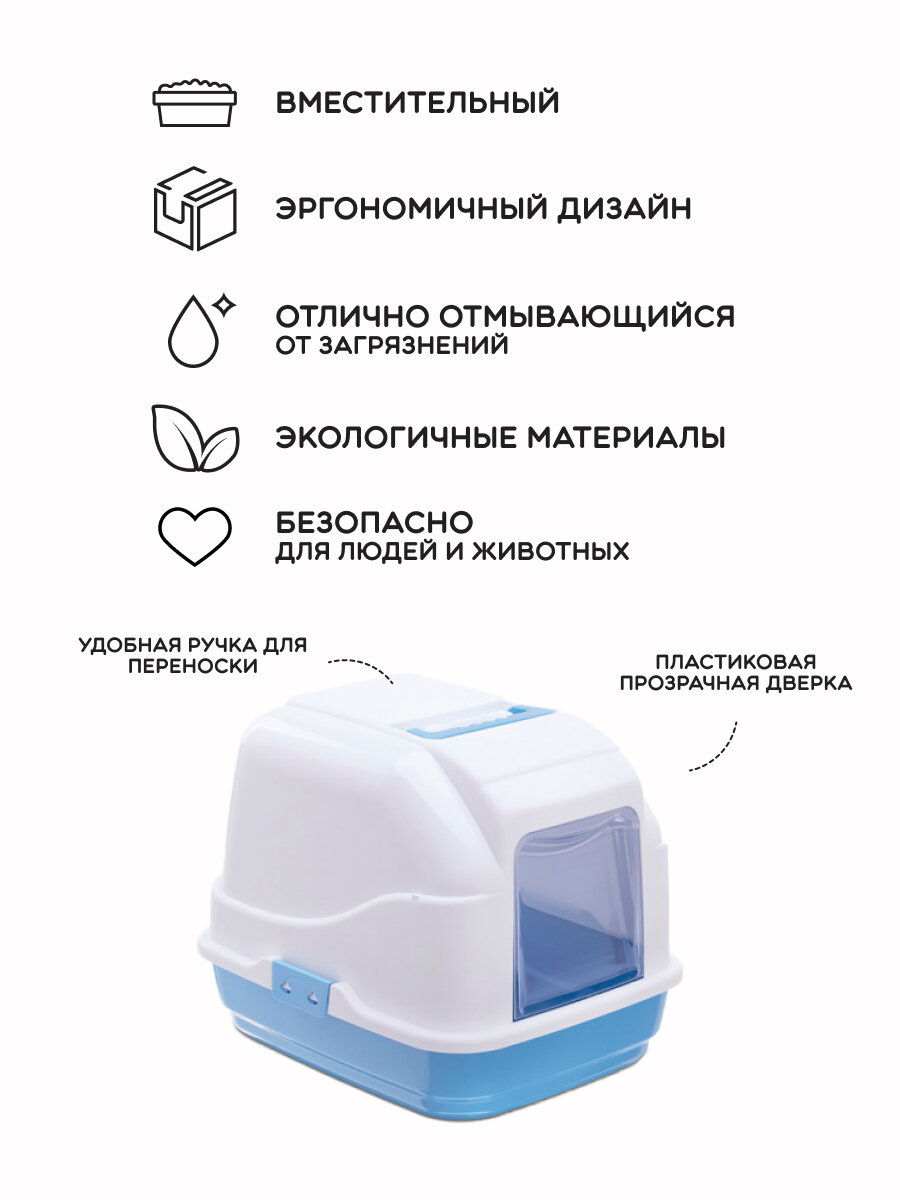 Туалет оснащен удобной ручкой для переноски, что позволяет легко перемещать его по дому при необходимости. Кроме того, туалет оборудован пластиковой прозрачной дверкой, которая обеспечивает конфиденциальность для вашего питомца.