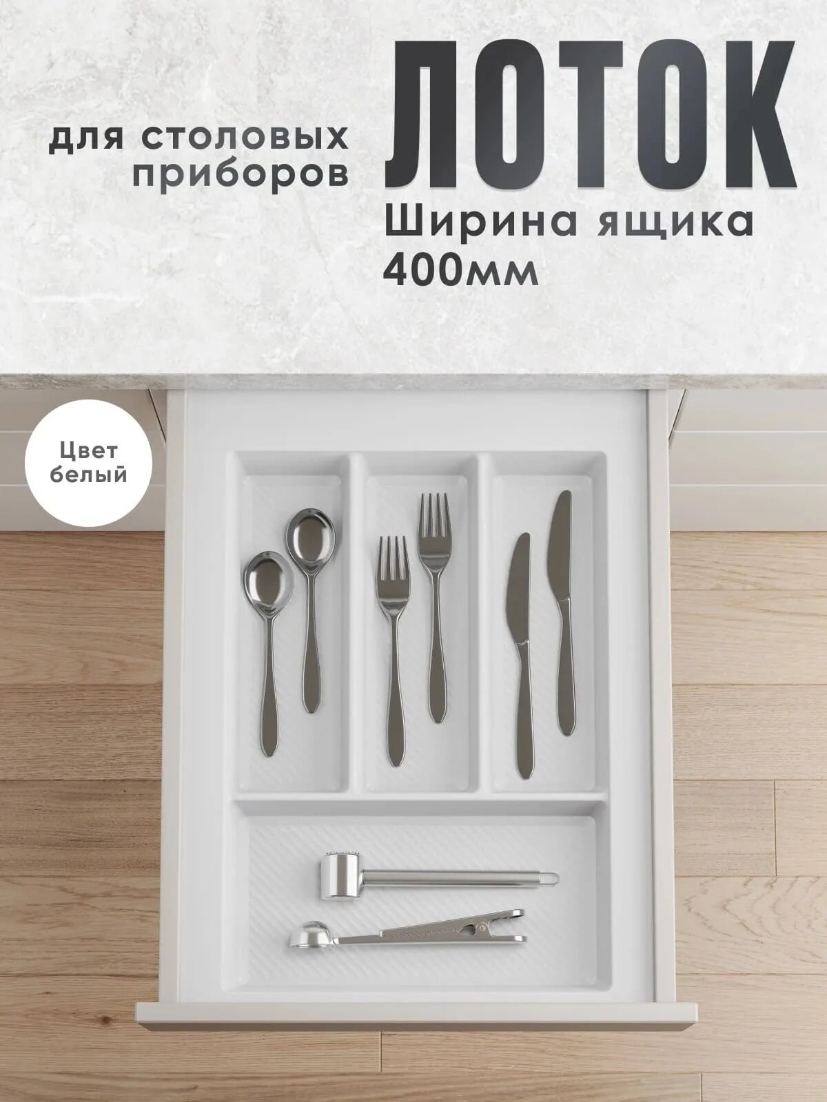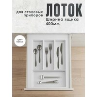 Лоток для столовых приборов, 400, белый - кухонный аксессуар, необходимый практически в любом доме. Лоток позволяет удобно рассортировать внутри кухонного ящика ложки, вилки, ножи и другие постоянно используемые столовые приборы. Лоток специально подбирается под размеры конкретного ящика стола или кухонного гарнитура.