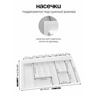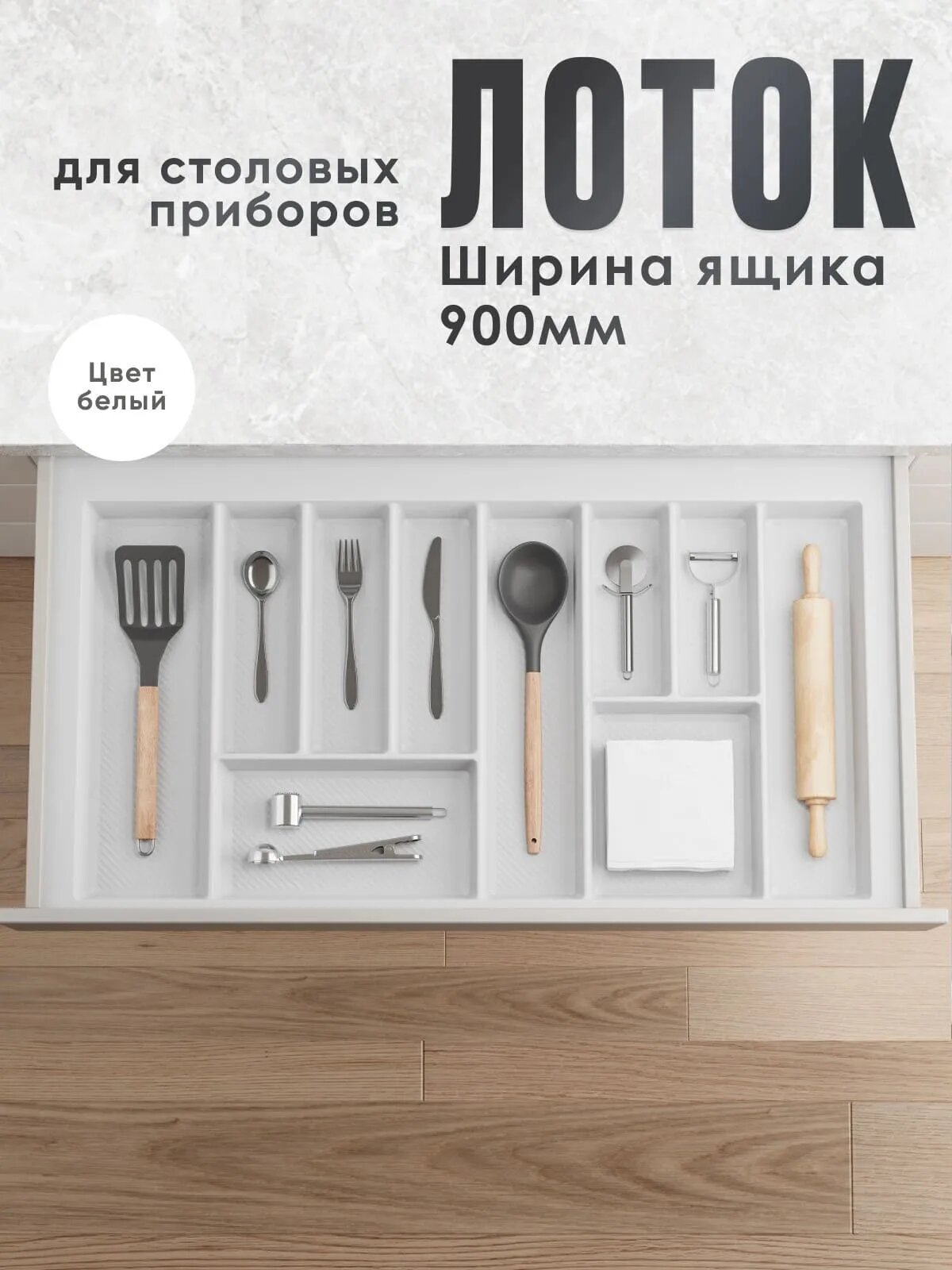 Лоток для столовых приборов, 900, белый - кухонный аксессуар, необходимый практически в любом доме. Лоток позволяет удобно рассортировать внутри кухонного ящика ложки, вилки, ножи и другие постоянно используемые столовые приборы. Лоток специально подбирается под размеры конкретного ящика стола или кухонного гарнитура.